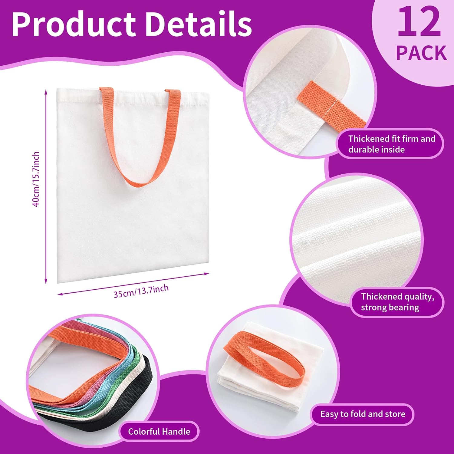 12Pack Canvas Tote Bags Bulk. 10oz Cotton Blank Canvas Tote Bags Reusable Grocery Bags Shopping Cloth Bags w/Colorful Handles Personalized Present Bags for Women. DIY. White