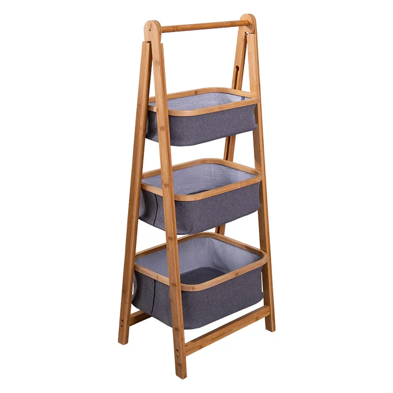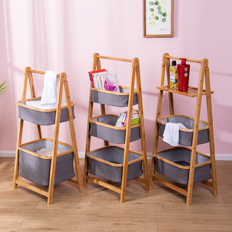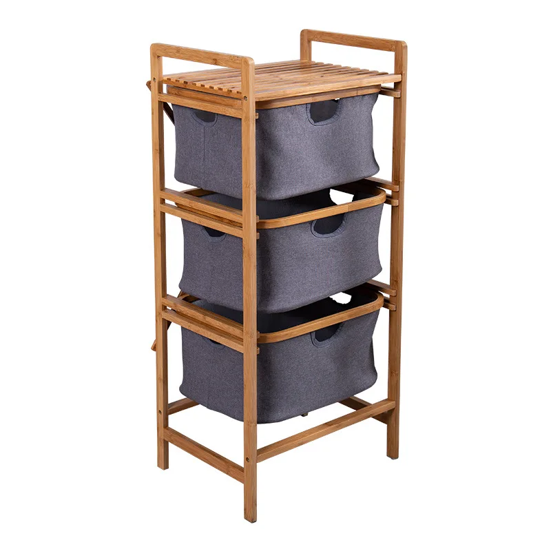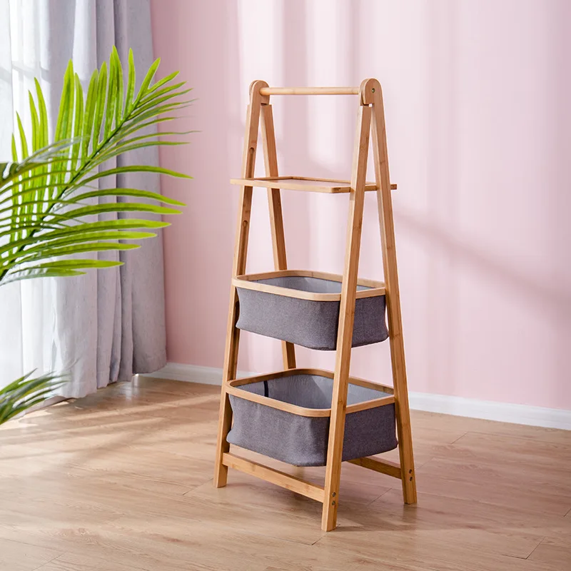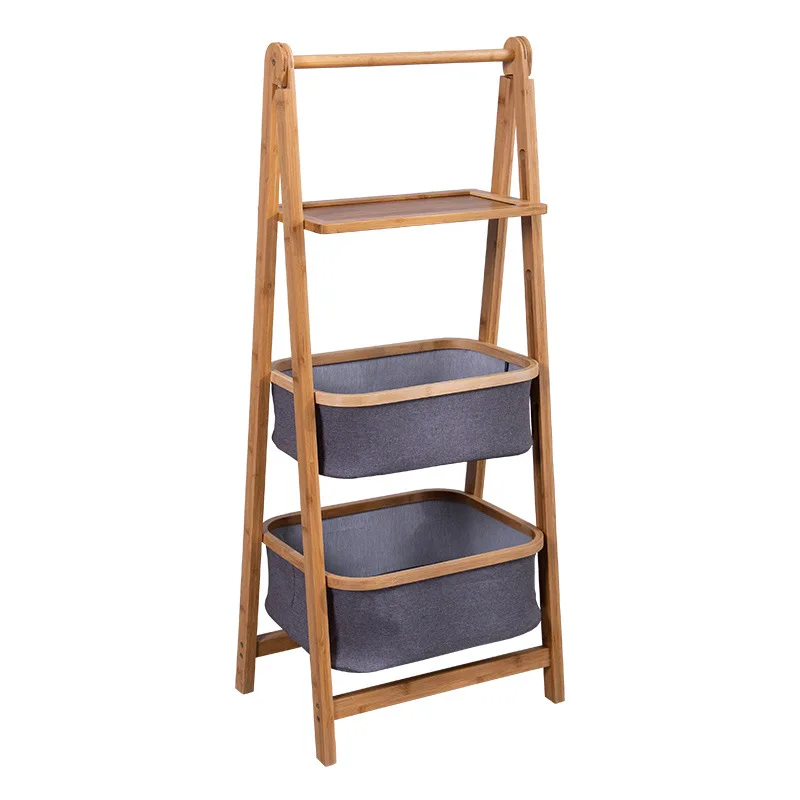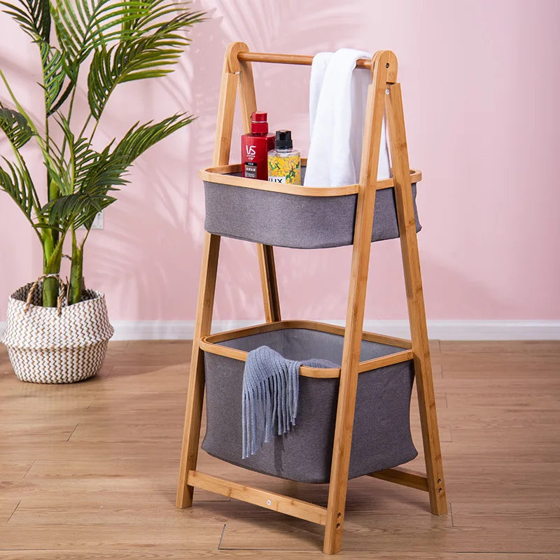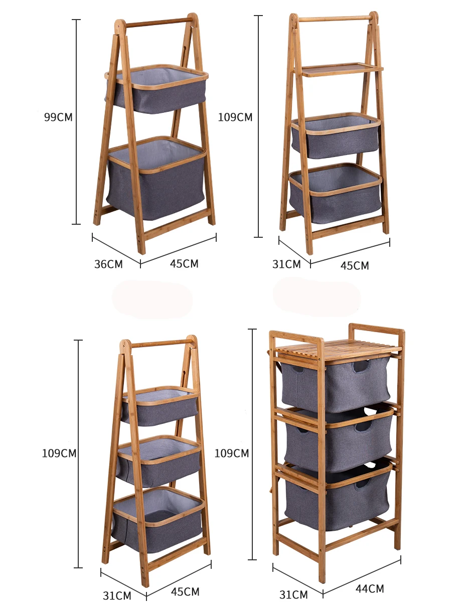 2/3 Tier Laundry Basket Bamboo Storage Shelf with Removable Storage Basket for Bathroom Living Room Bedroom