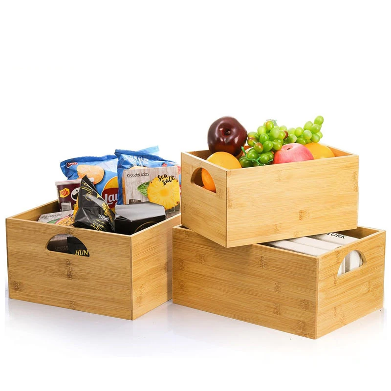 3 Pack Natural Bamboo Storage Bin Rectangle-shaped Nesting Organizer Lacquer Finish Stackable Cubby Basket Container Crate