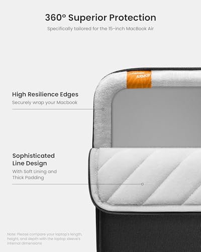 • Warranty & Compatibility: You can get a 12-month worry-free warranty. friendly and timely customer support. and a laptop sleeve that perfectly fits: 15-inch New MacBook Air M4/A3241 2025. M3/A3114 2024. M2/A2941 2023. Dell XPS 15 Plus Laptop. 15-inch MacBook Pro (A1990 A1707). 15-inch Microsoft Surface Laptop 7(Copilot+ PC)/6/5/4/3. etc. Internal Dimensions – 13.58 x 9.6 x 0.87. Front Pocket: 11.22 x 8.46