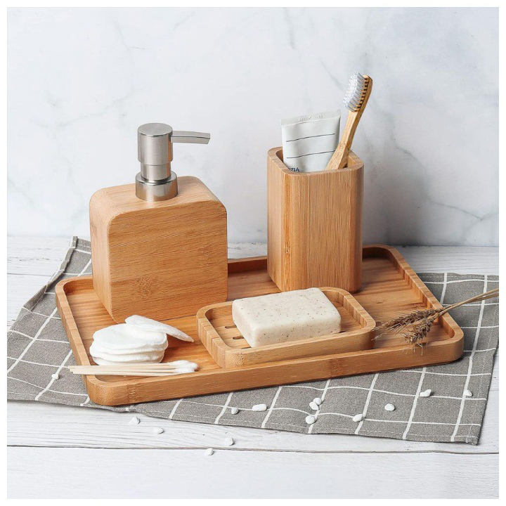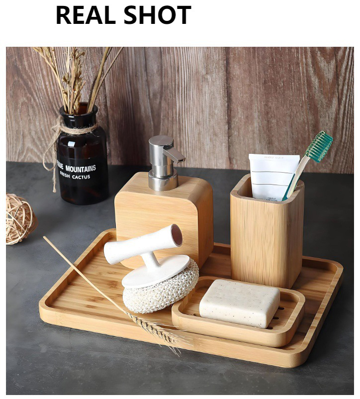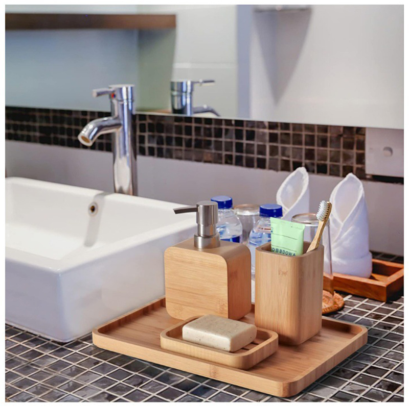 4Pcs Handmade Bamboo Sink & Bathroom Accessory Sets Retro Set Natural. Soap Dish Holder for Shower Lotion Soap Dispenser