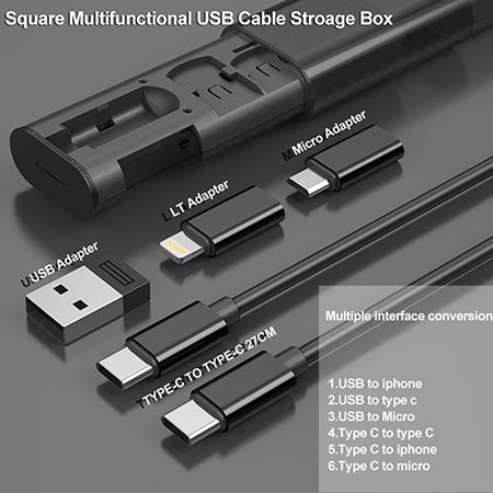 The 6-in-1 travel charging cable set can simultaneously Charging a variety of digital devices, it has a variety of interfaces, including iPhone, Android, Type-C, etc., and is compatible with most digital devices on the market. The product is made of high-quality materials, reliable in quality, safe and portable, and can be easily placed Put it in your pocket or luggage and use it anytime, anywhere. Equipped with a simple storage box, it is easy to store and carry. It is a must-have product for travel and daily life.