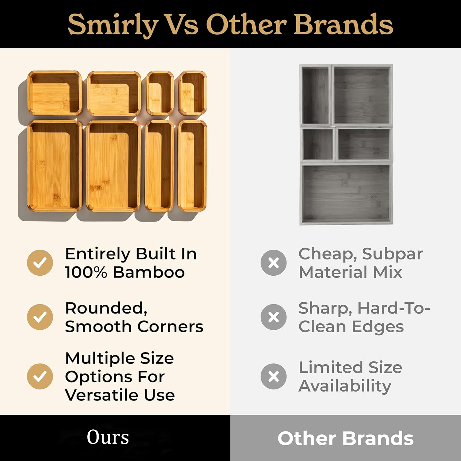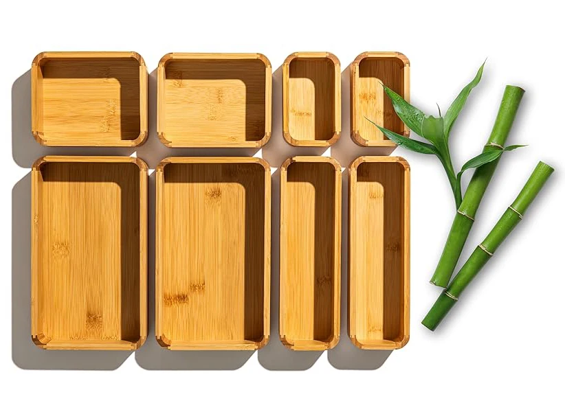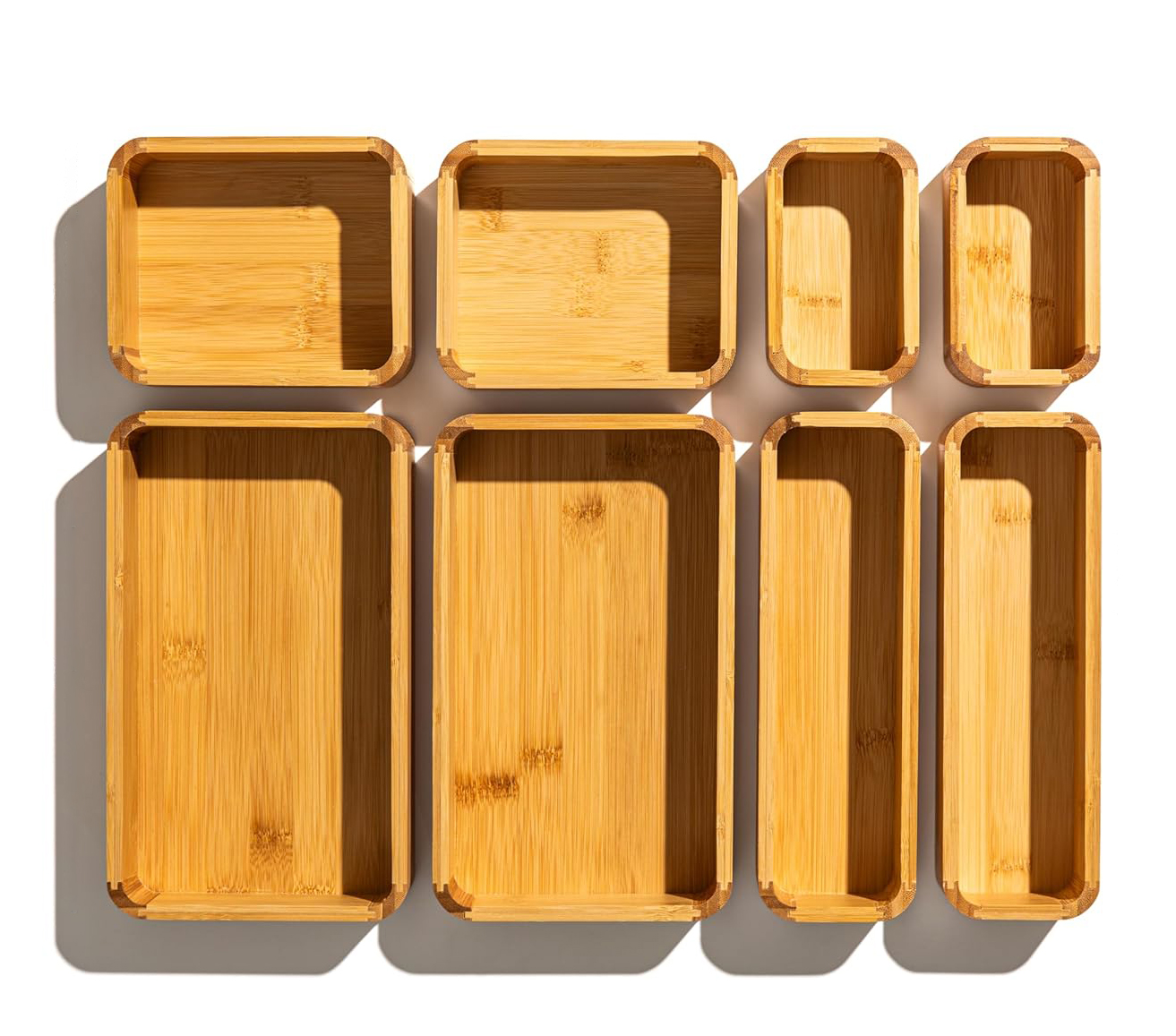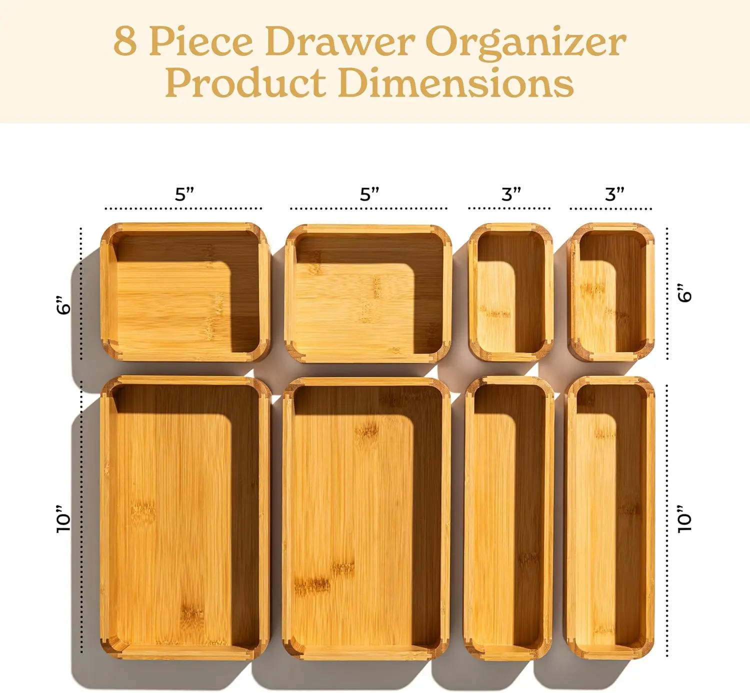Product Name | 8-Piece Bamboo Kitchen Drawer Organizer Set for Large and Small Utensils. Multi-use Storage Box – Bathroom. Nightstand. Jewelry.Cutlery. Knife. Spice. Towel. Junk Drawer Tray | |||||