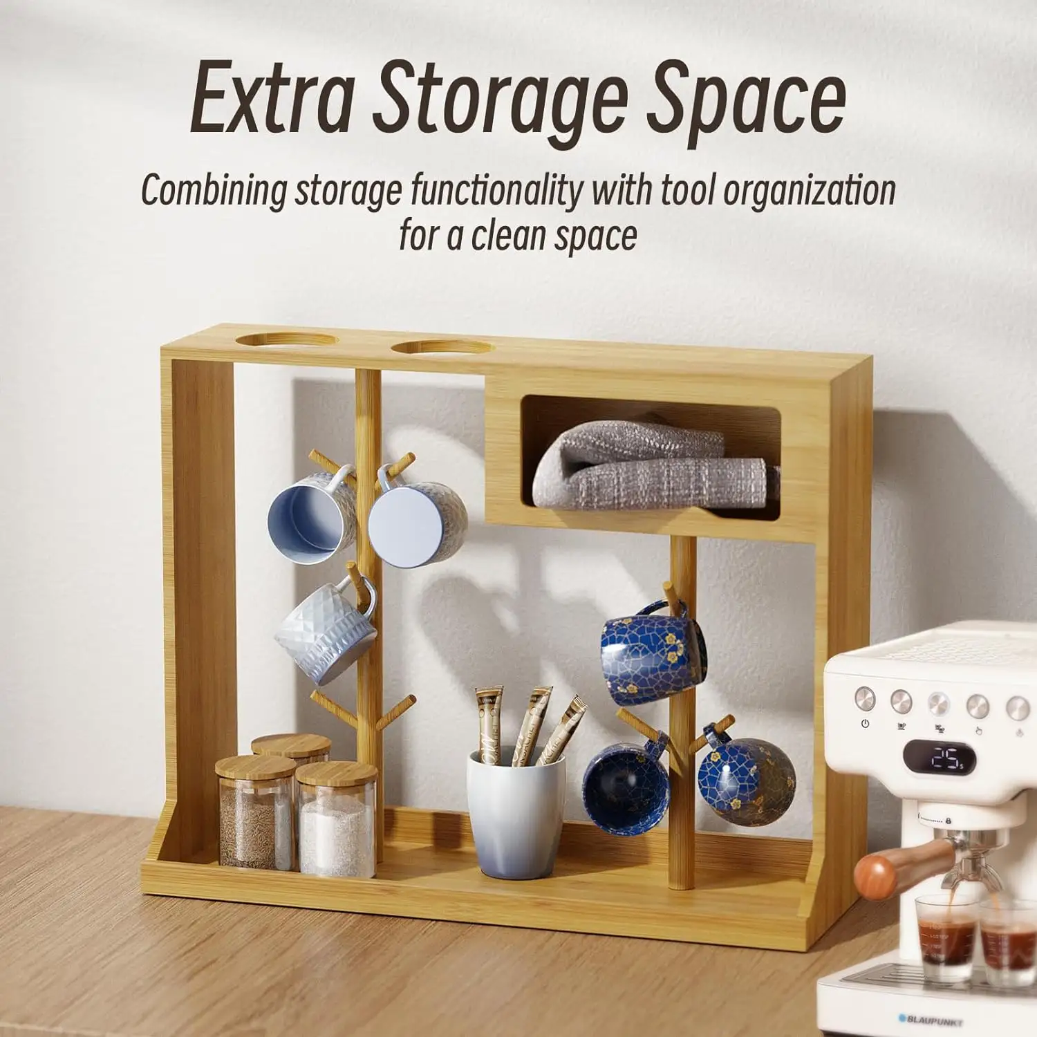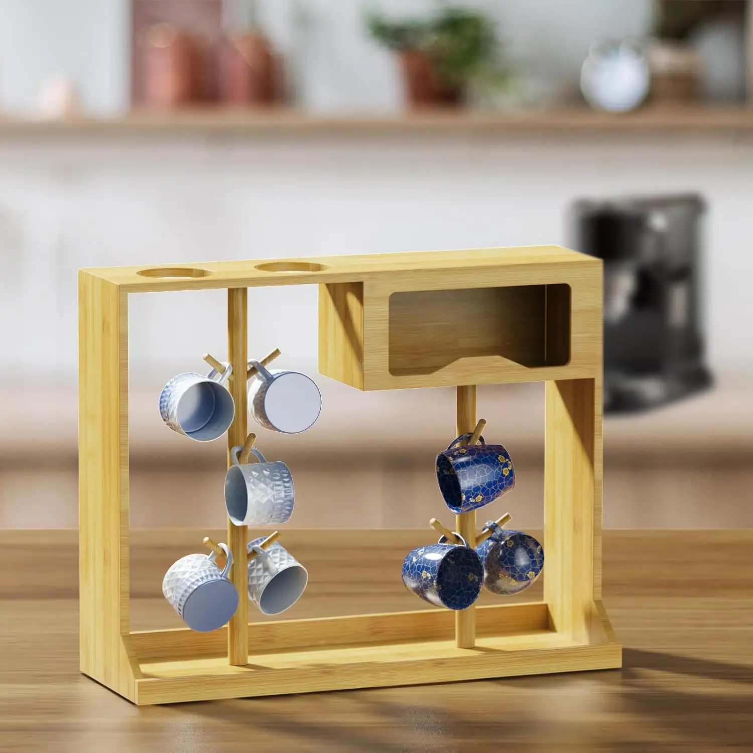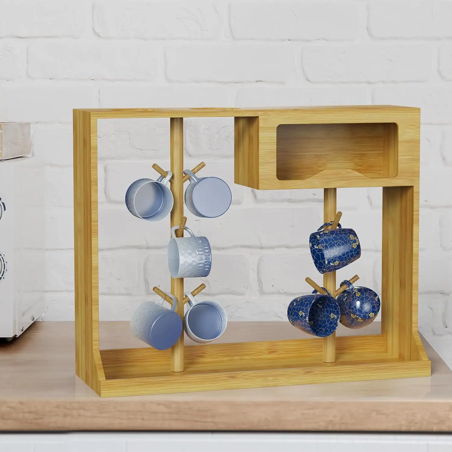 Bamboo Mug Holder. Coffee Cup Holder with 8 Hooks and Trash Bag Container.Coffee Mug Cup Hanger Stand for Counter