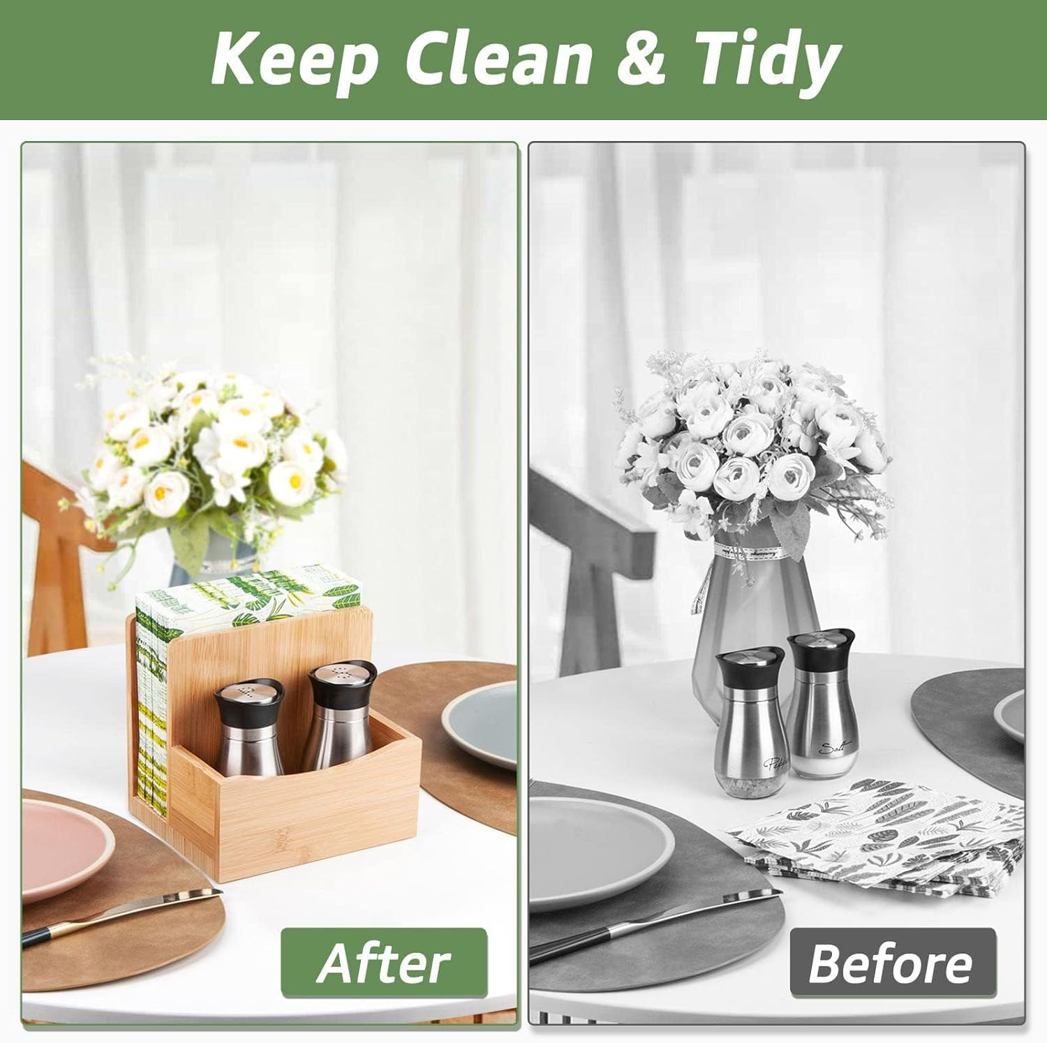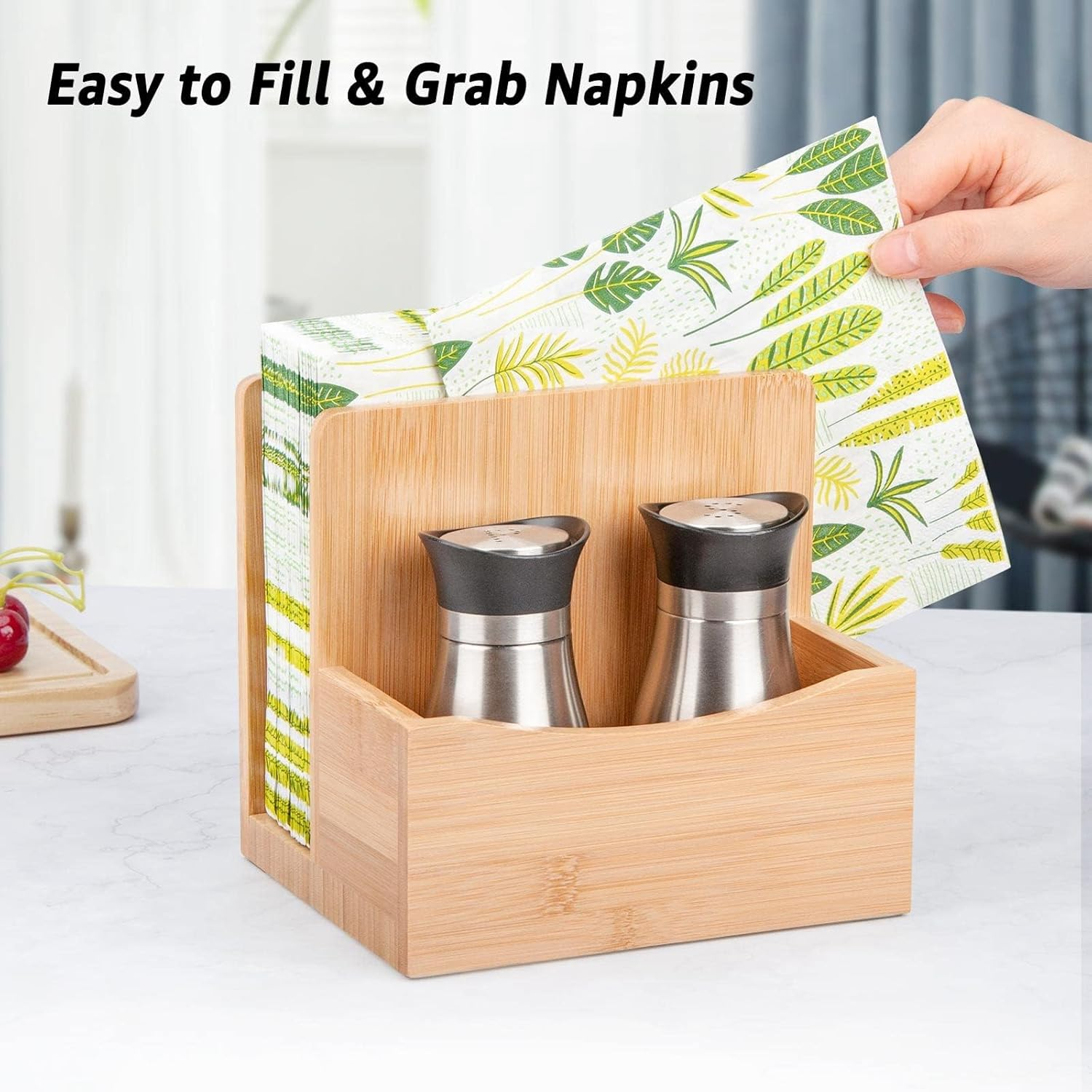 Bamboo Napkin Holder for Table Paper Napkin Holder Standing Multi-purpose Napkin Holder Organizer with Salt and Pepper Storage