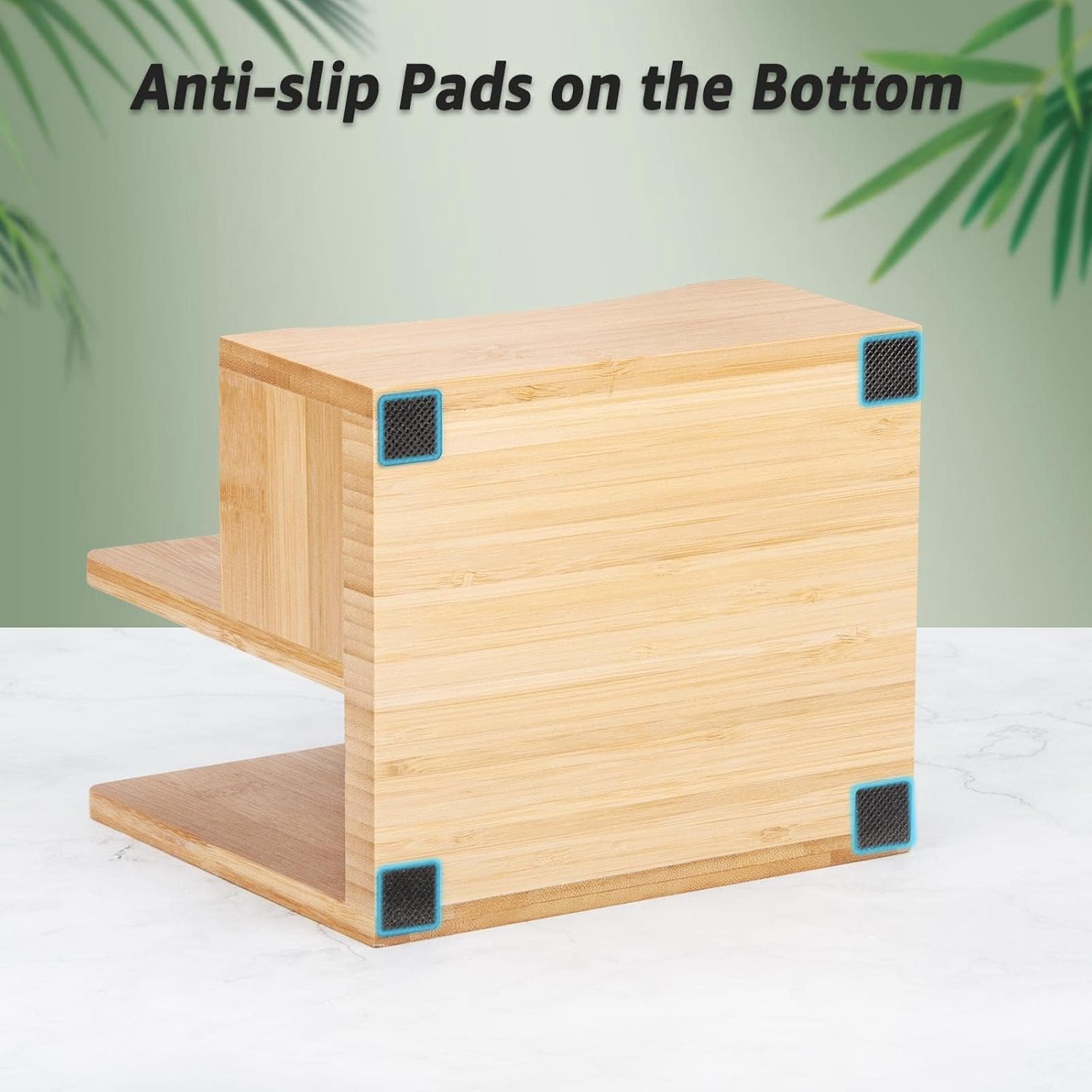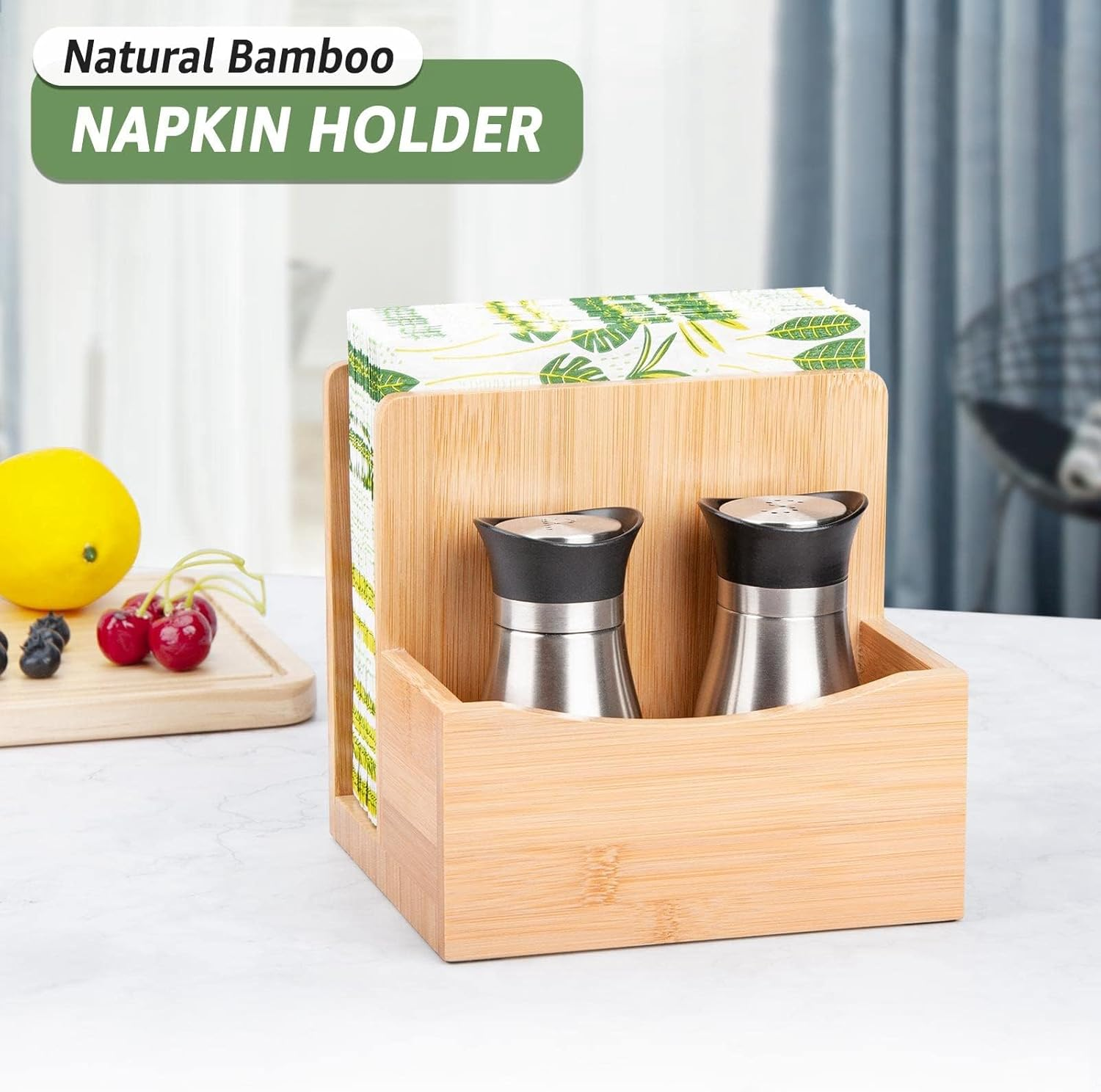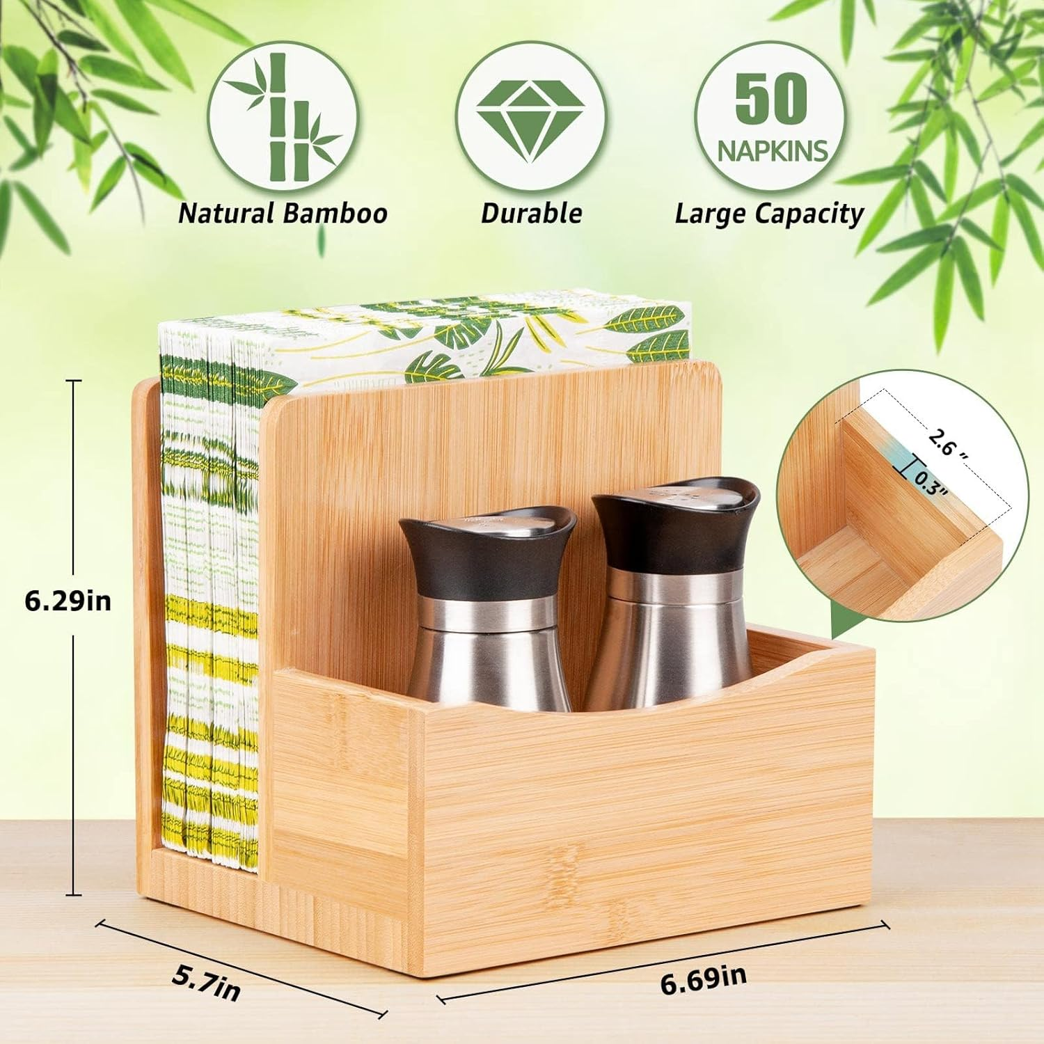 Bamboo Napkin Holder Standing for Kitchen Table Upright Napkin Stand Wooden Napkin Holder with Caddy for Pepper Salt Shaker