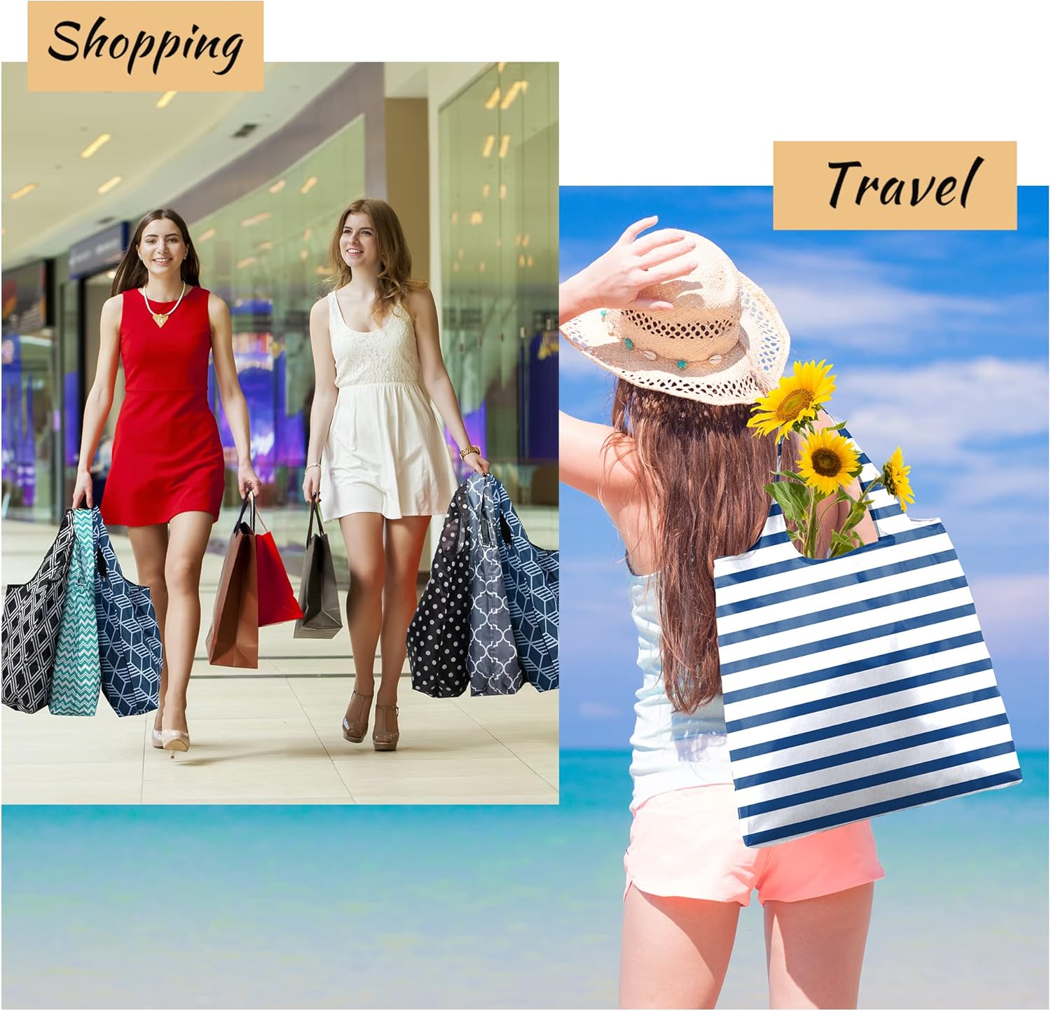 - X-LARGE CAPACITY & Sturdy: These cute reusable grocery bags are very large which can hold up to 50+ pounds of groceries and replaces 2-3 conventional grocery bags. And these foldable reusable grocery bags are reinforced with bias tape which makes them hold heavy loads safely. Long handles of the large reusable shopping bags allow for hand holding or carry on the shoulder for easier carrying. perfect reusable grocery bags bulk for shopping. groceries. travel. storage.