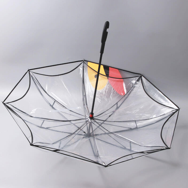 Custom Design Printed Clear Inverted Umbrellas with Branded Logo from China Towum Factory. C Shape Handle. Double Layer Canopy. Design and Branded Logo Can Be Printing on Both Layers.