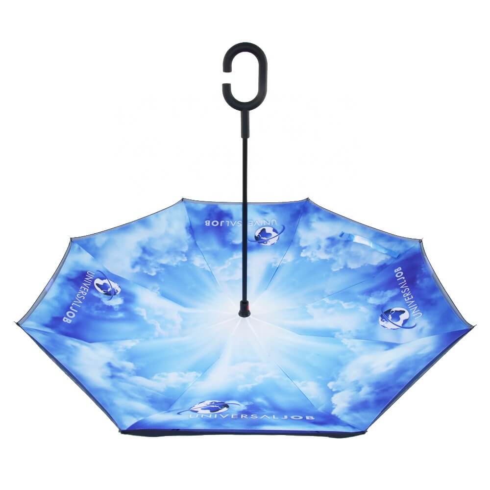 Reversible Umbrella Custom Design or Logo Printing. Double Layer Canopy Windproof UV Protection. Upside Down Umbrella with C-Shaped Hande. Automatic Open Close.