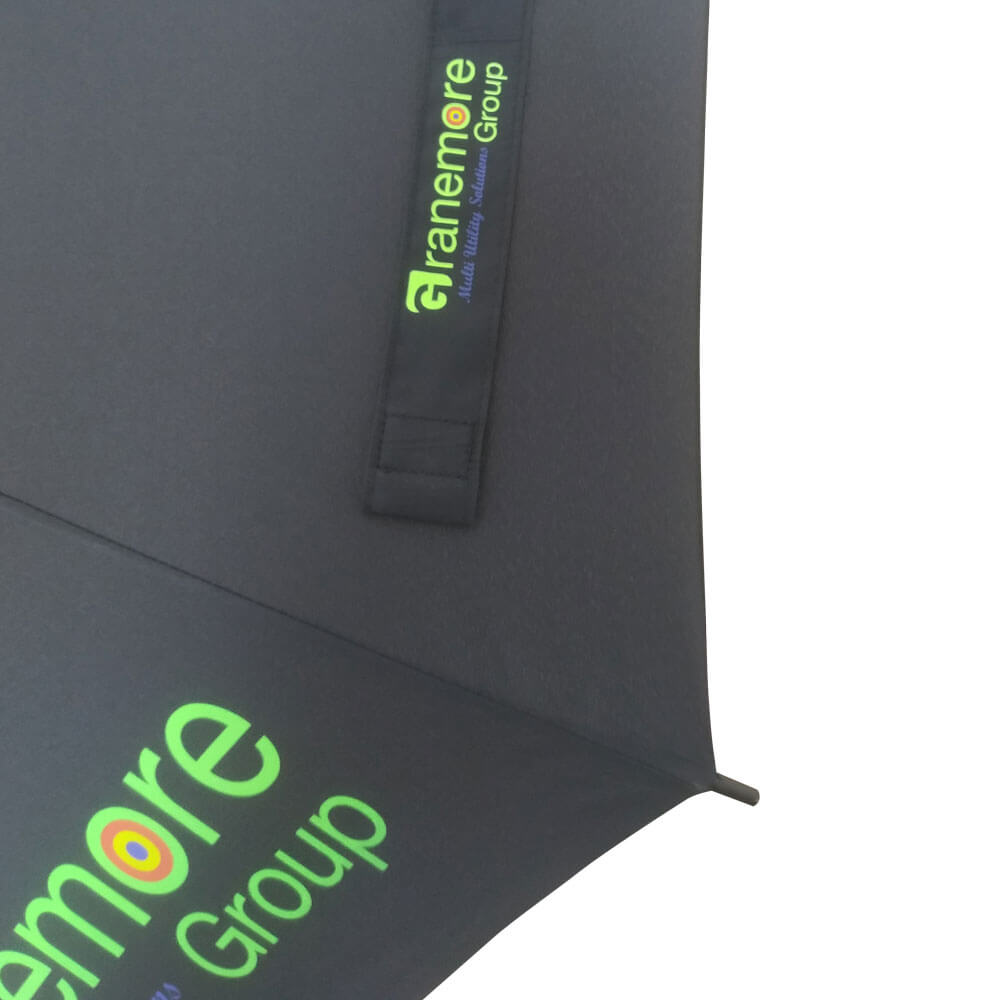 Fabric Colour: Black and White. Custom Design Black and White Umbrella with Printed Logo Printing. Frame: Black. Handle: Black with Silver White Button