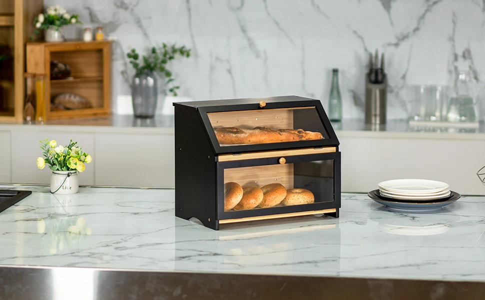 Double Layer Large Bread Box for Kitchen Counter. Wooden Large Capacity Bread Storage Bin