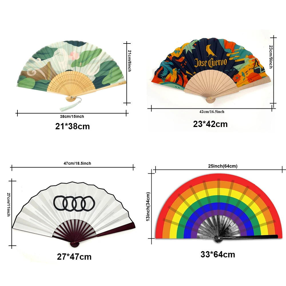 We have different types of fans for choosing.Different sizes: 21*38cm. 23*42cm. 27*47cm. 33*66cm;