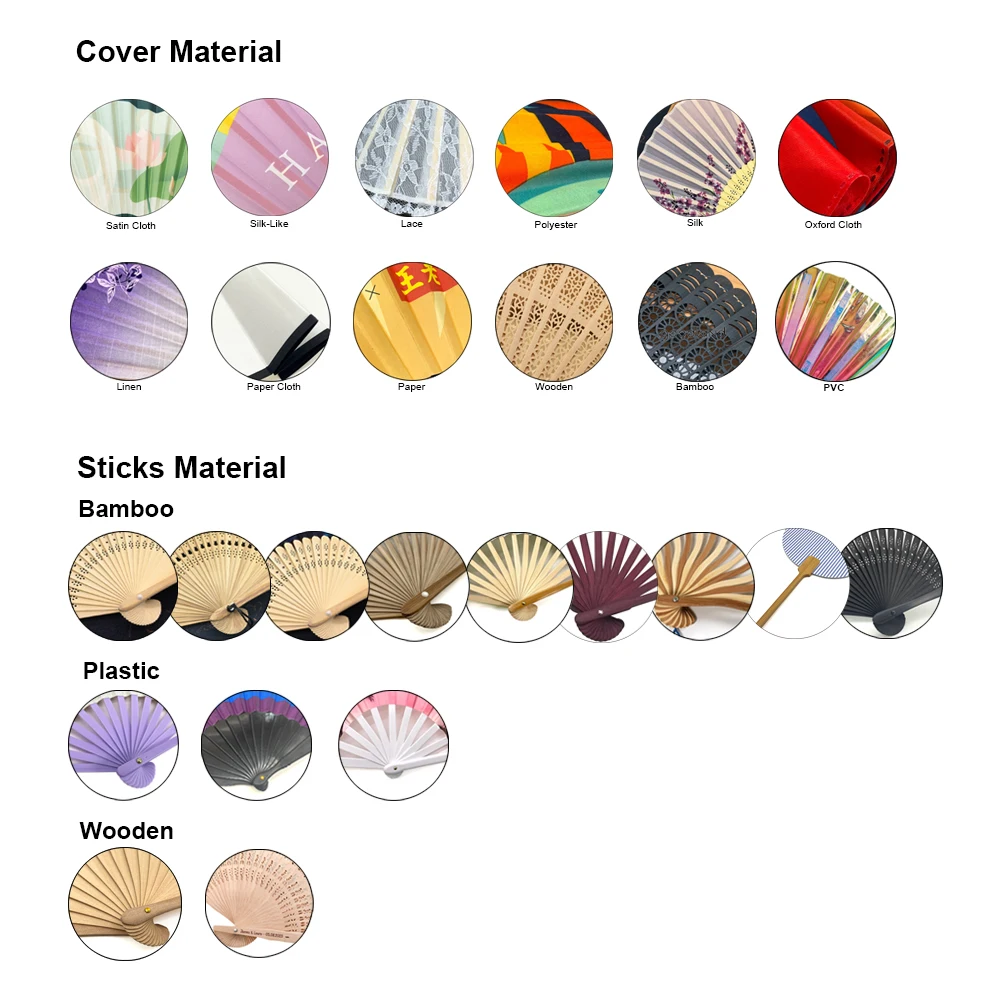 Our products include different grades and different shapes of bamboo silk hand fans. bamboo paper hand fans. wooden fans. plastic fans. bamboo lace fans. different kinds of customized hand fans. men/women fans. high quality silk fans. etc. All these fans support RTS service.