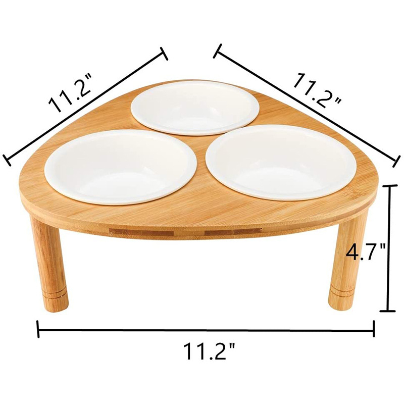 Eco-Friendly Bamboo Raised Cat Bowl Triple Bowl Elevated Dog Stand Triangle Shape Ceramic Cat Food Bowls Animal Feeders