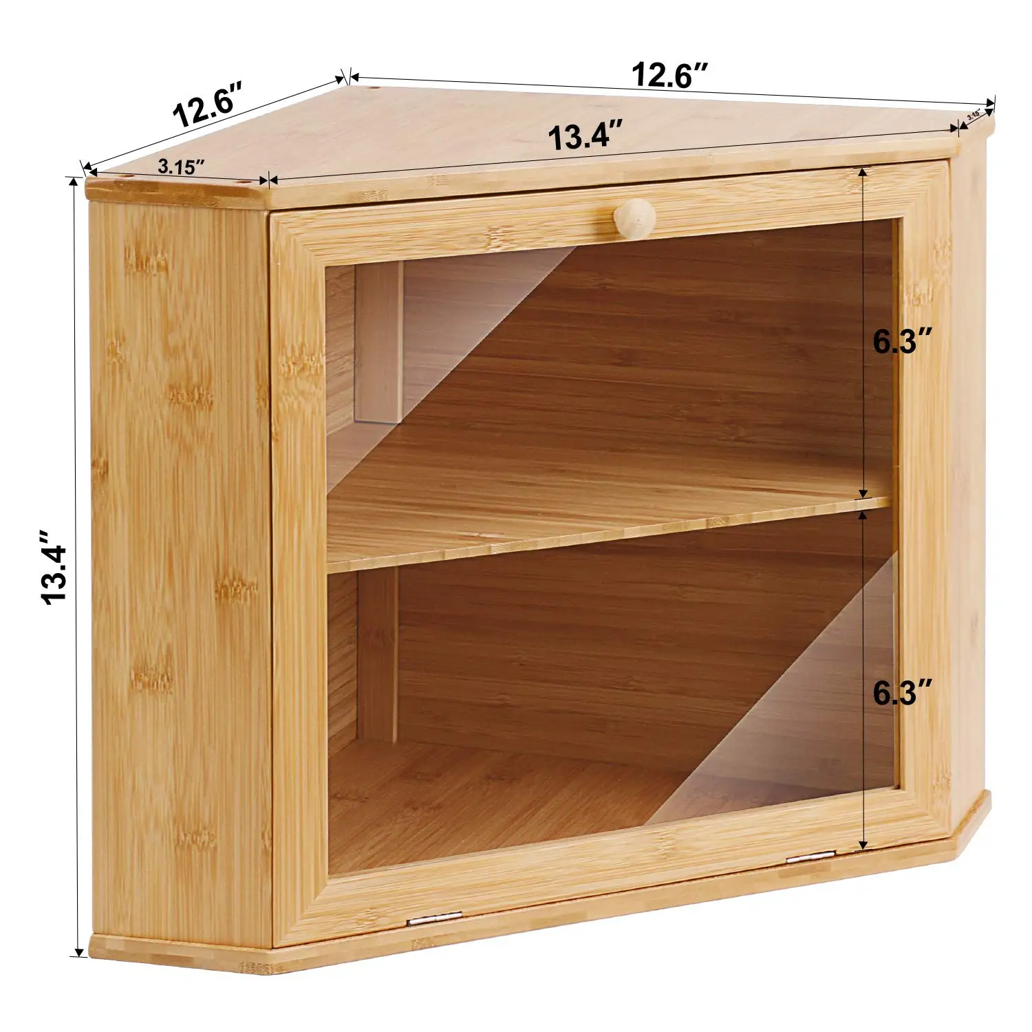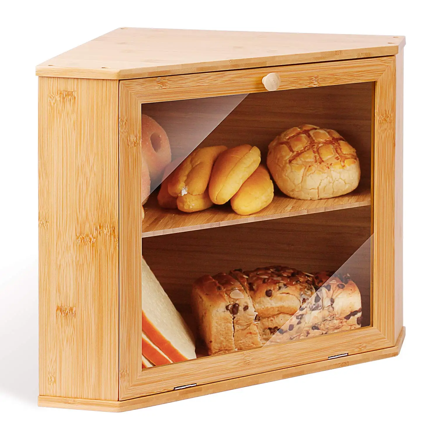 Eco-friendly Large Capacity Bamboo Bread Food Storage Bin Double Layers Bamboo Corner Bread Box for Kitchen Counter