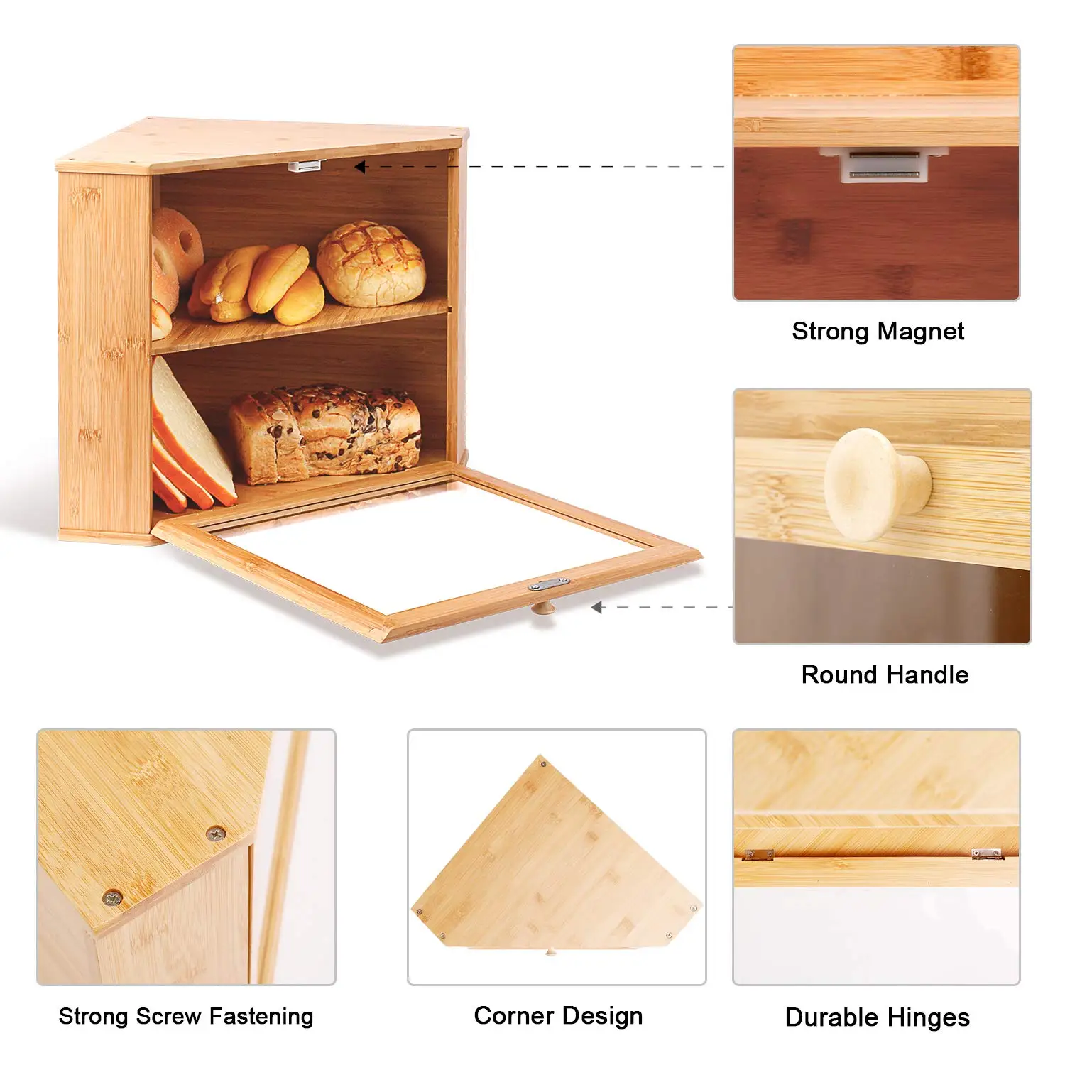 Product Name | Amazon Hot Sell Large Capacity Bamboo Bread Food Storage Bin Double Layers Bamboo Corner Bread Box for Kitchen Counter | |||||