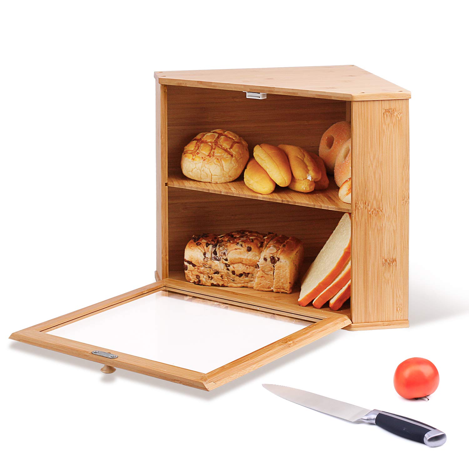 Eco-friendly Large Capacity Bamboo Bread Food Storage Bin Double Layers Bamboo Corner Bread Box for Kitchen Counter
