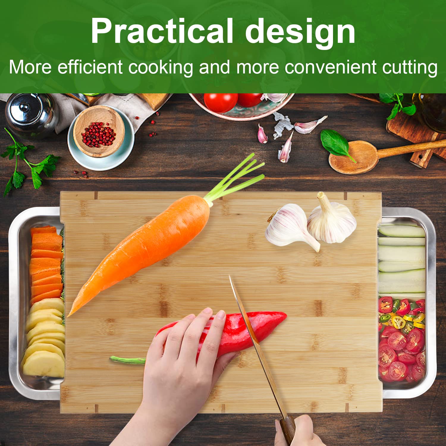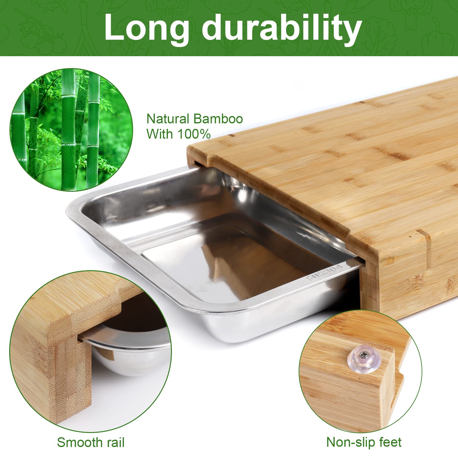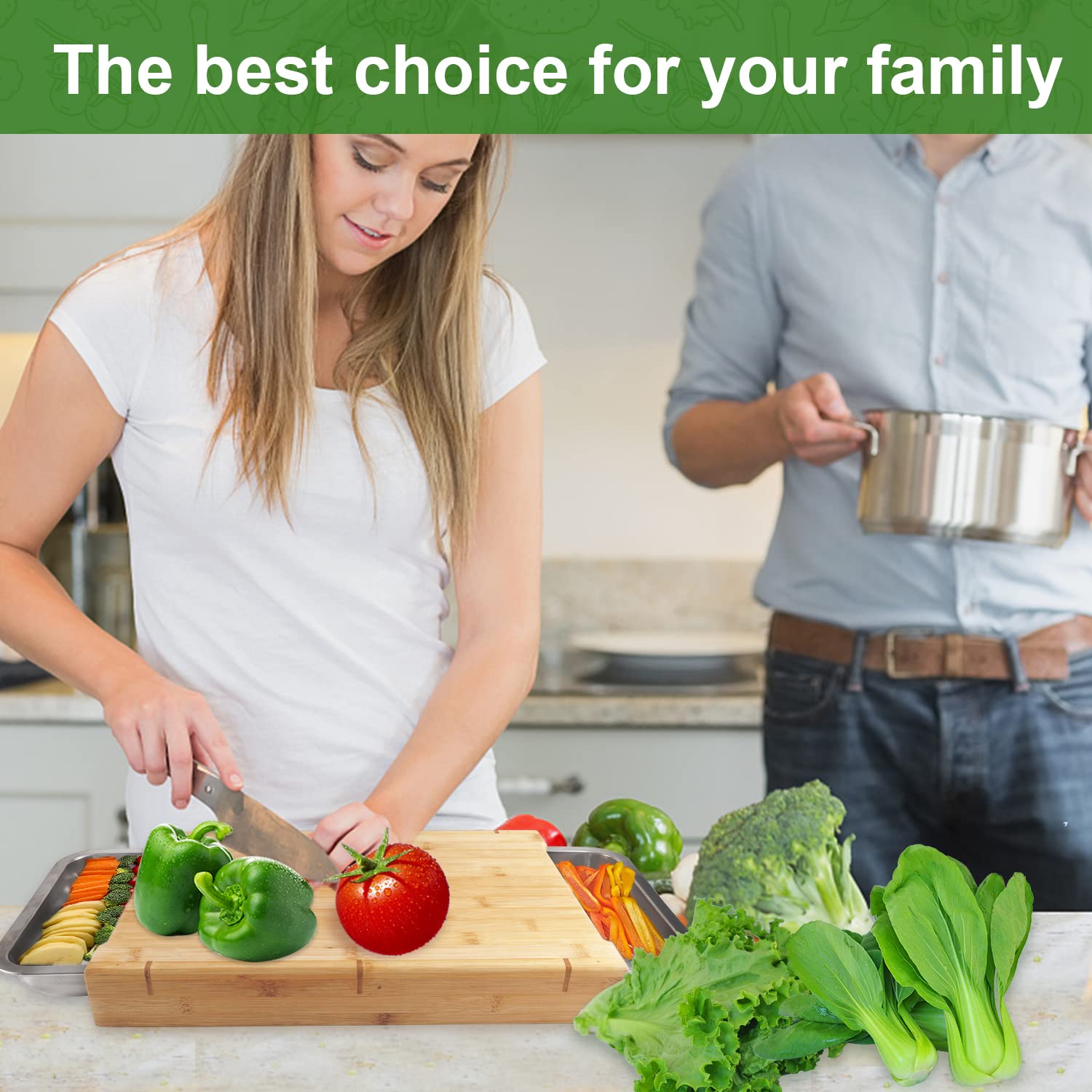 *This cutting board have a built-in handle that makes it easier to take*Heavy chopping block will stabilize on the table when cutting*Smooth and flat surfaces protect your knife won’t become blunt*Made of 100% natural bamboo. more durable and environmentally friendly than plastic*The around grooves prevent the juice overflow to the countertop