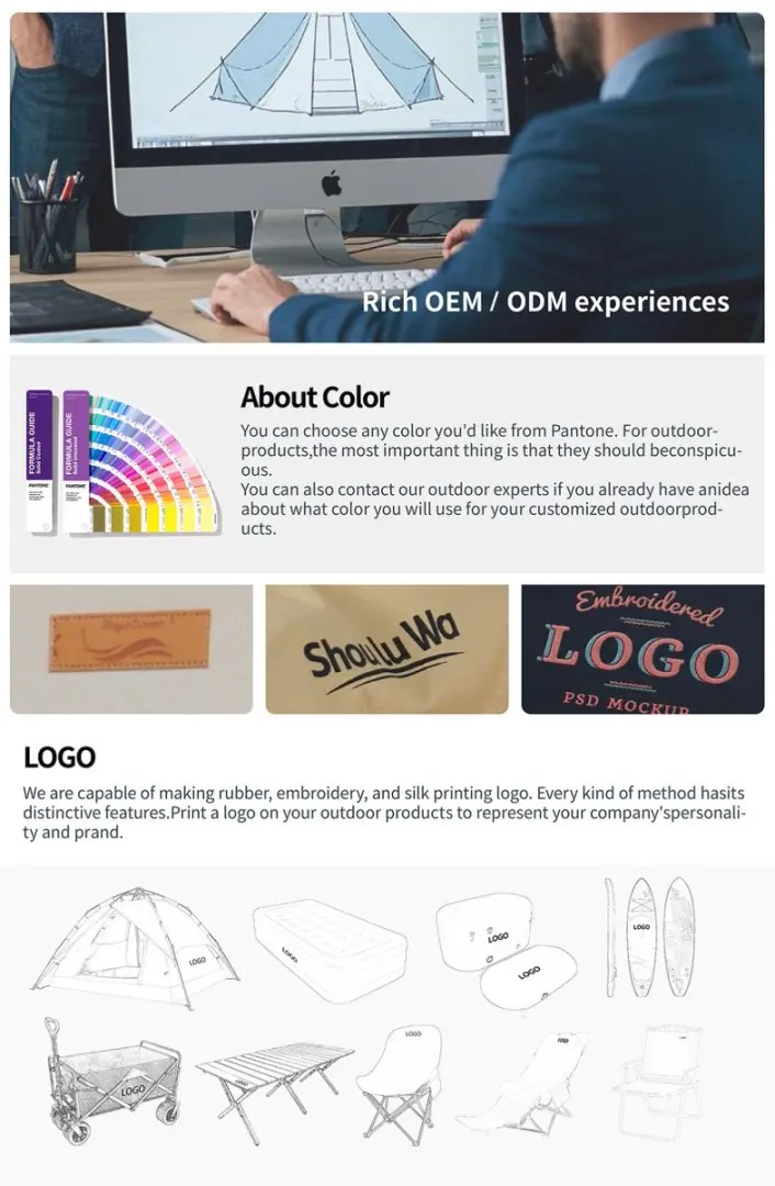 Our products include Camping Tent. Raincoat. Air Bed. Camping Table&Chair. Beach Chair.Aqua Bag and other outdoor tools. We canprovide ODM. OEM and customization with high quality. competitive price. also good after-sale service.