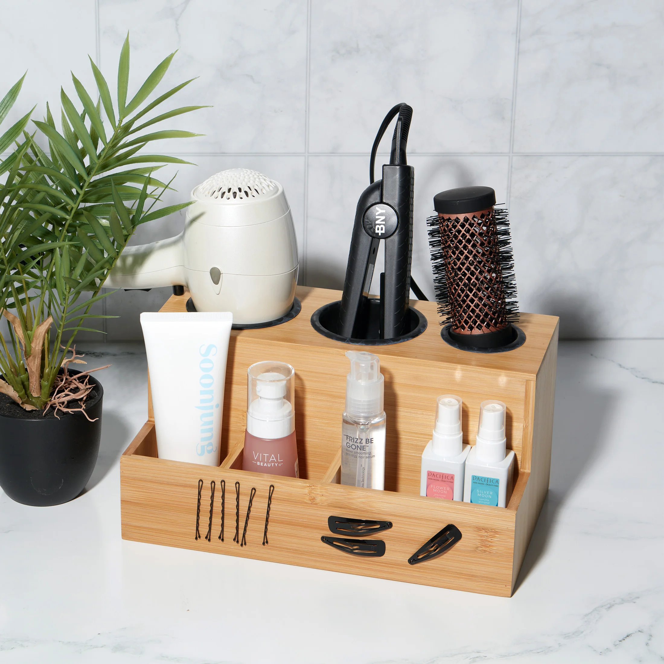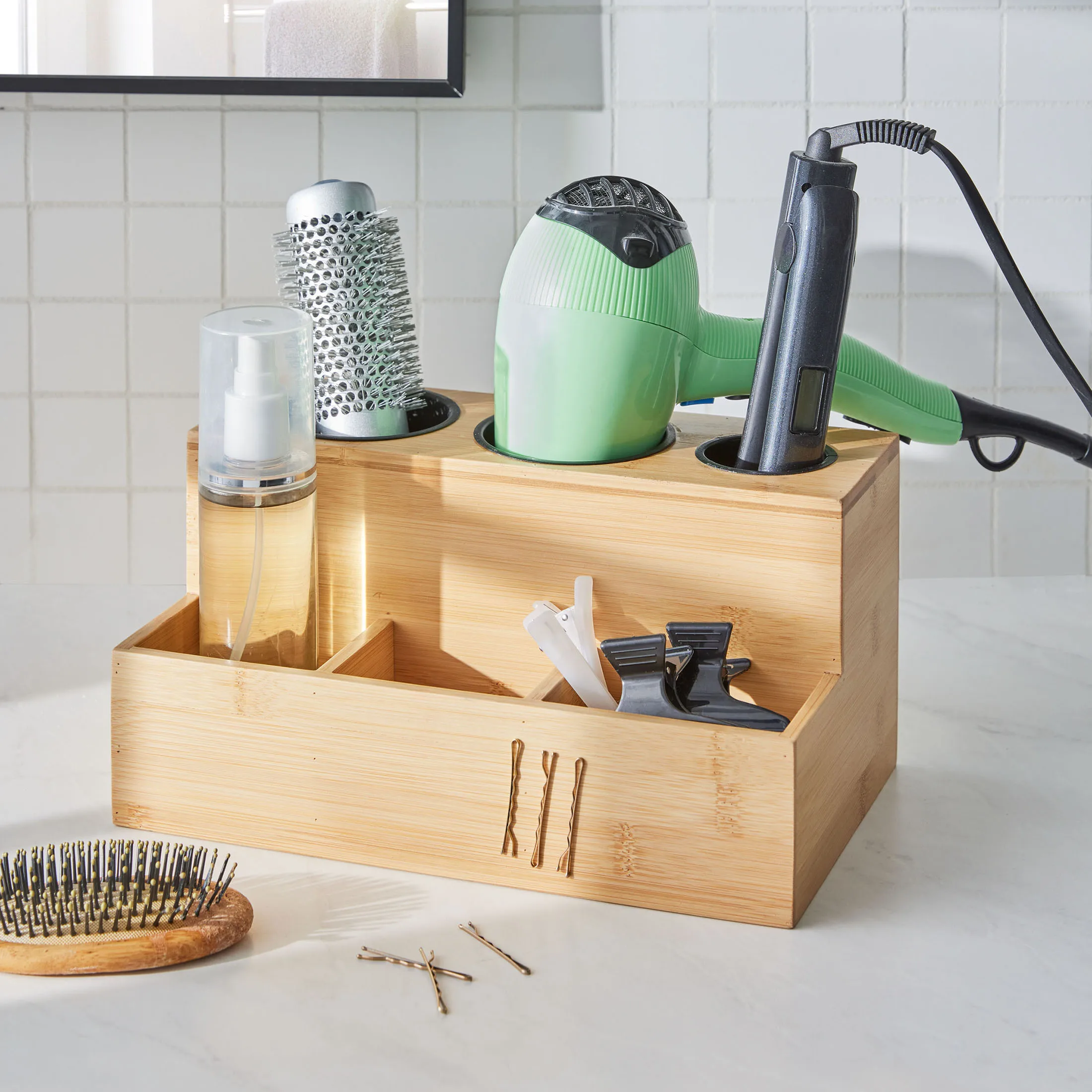 Hair Tool Storage Organizer. Bamboo Hair Tool Organizer for Bathroom. Kitchen and Makeup.Hair Organizer Storage Perfect