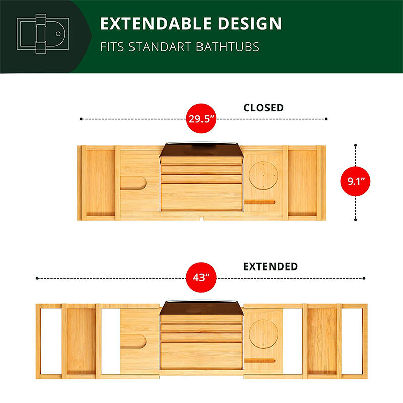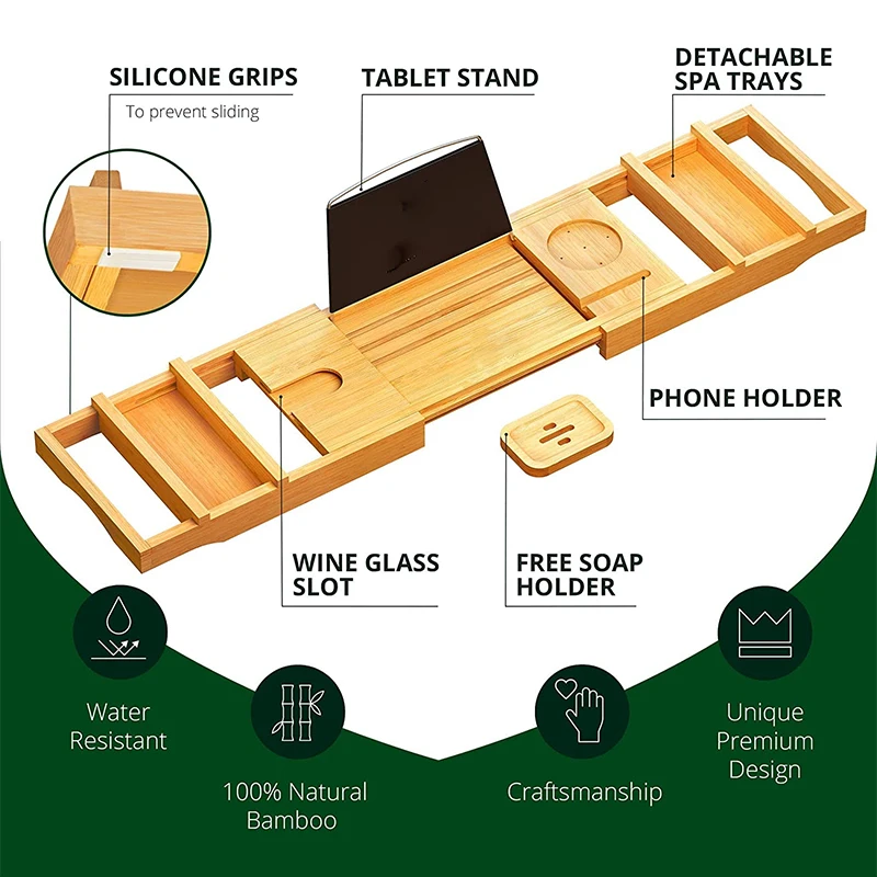 Homex 1-2 Person Bamboo Bathtub Caddy Tray with Wine Book Holder Free Soap Dish Extending Sides-Bathroom Sets Trusted Supplier
