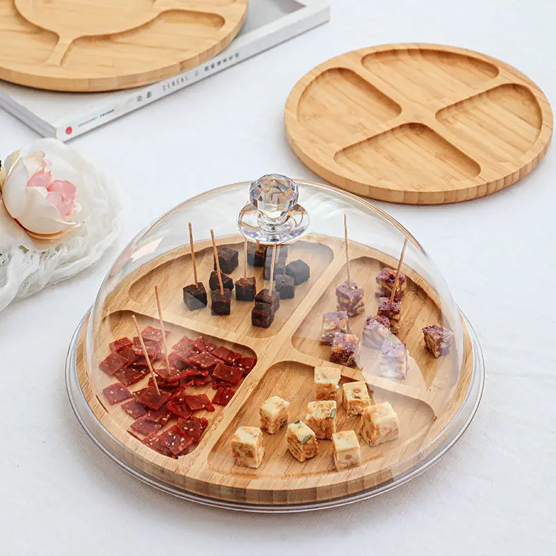 Hot Sale Bamboo Serving Platter Tray Round Candy Tray Nuts Snack Serving Plates Dry Fruit Serving Tray With 4 Section