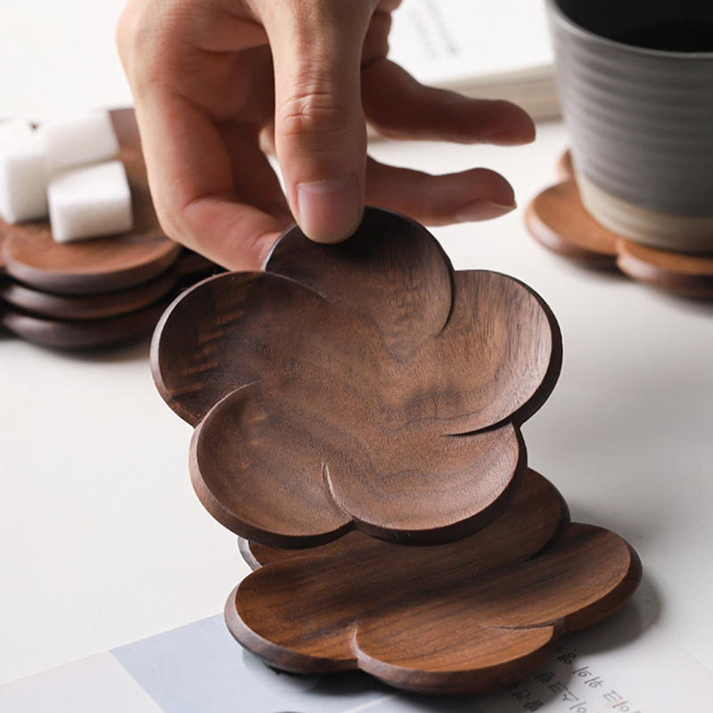 Hot Selling Black Walnut Wood Creative Patal Shape Plum Blossom Cup Coaster Set Modern Design for Coffee & Tea Shops