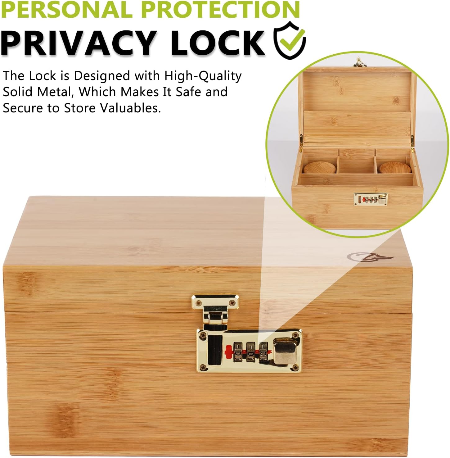 Large Bamboo Box with Combination Lock Decorative Box for Home Great Gift Choice Stash Storage Lockbox with Storage Jar. Tray