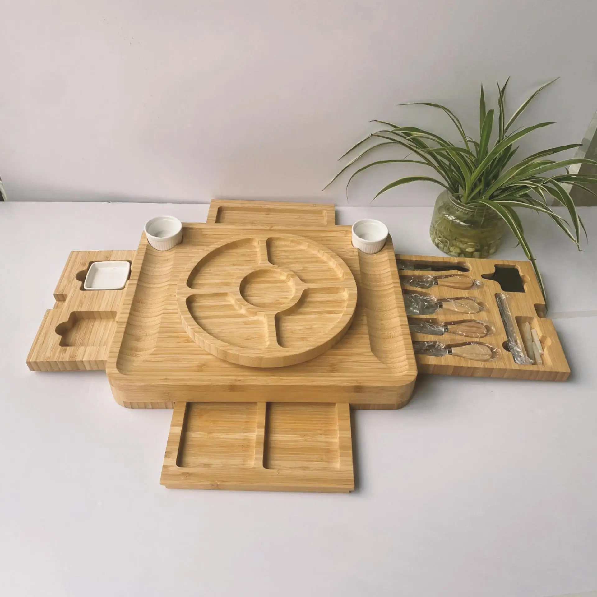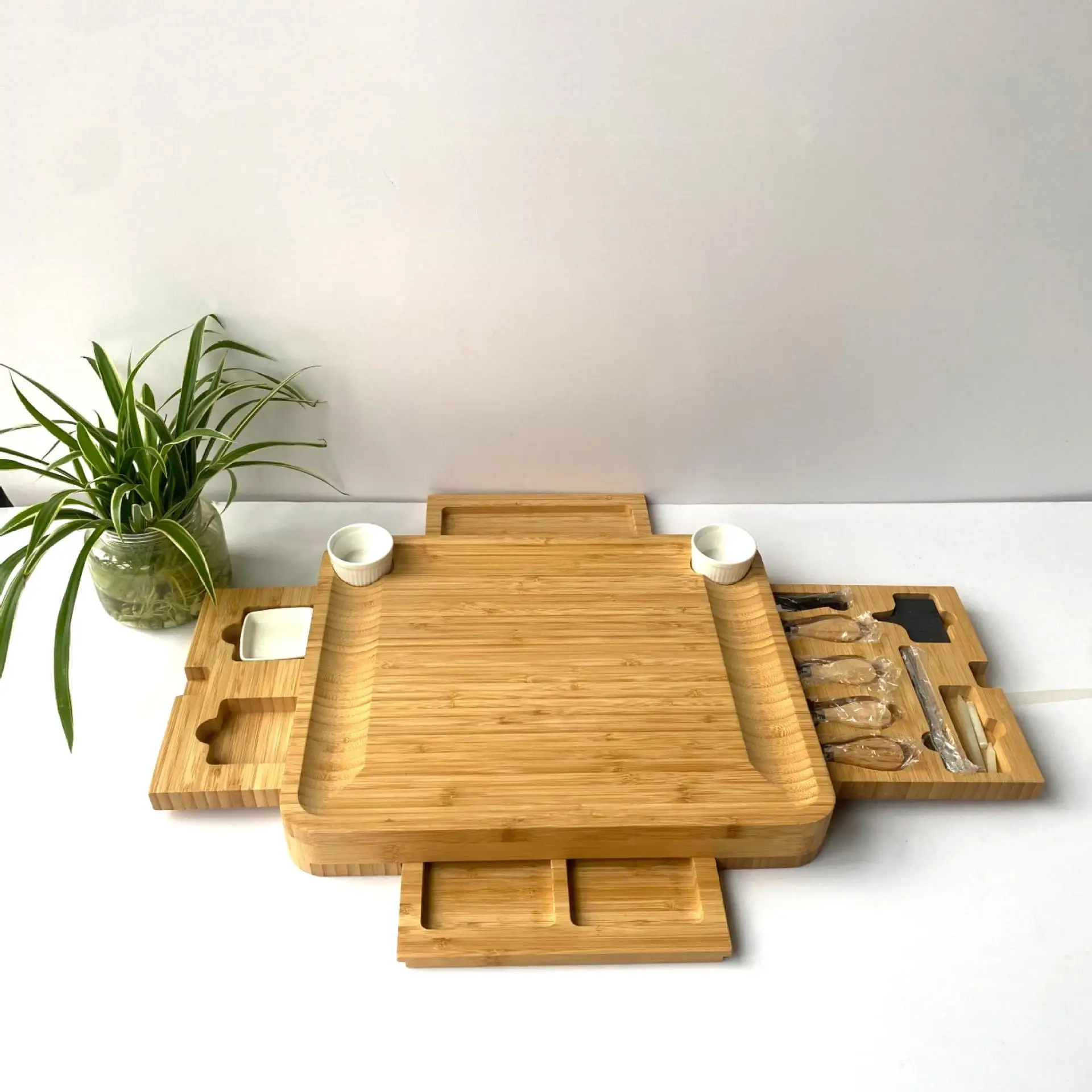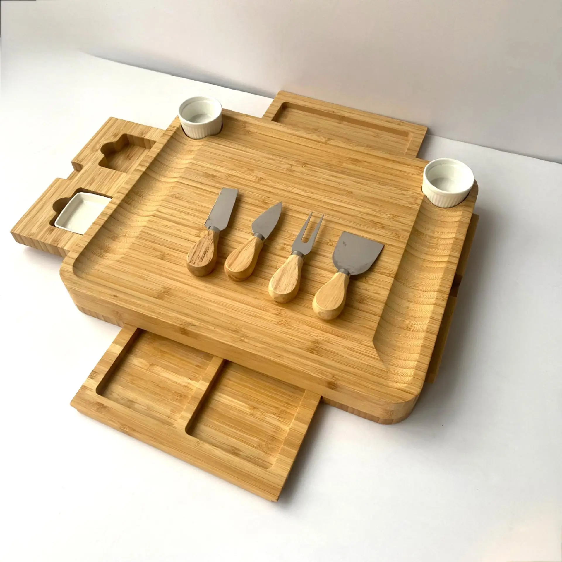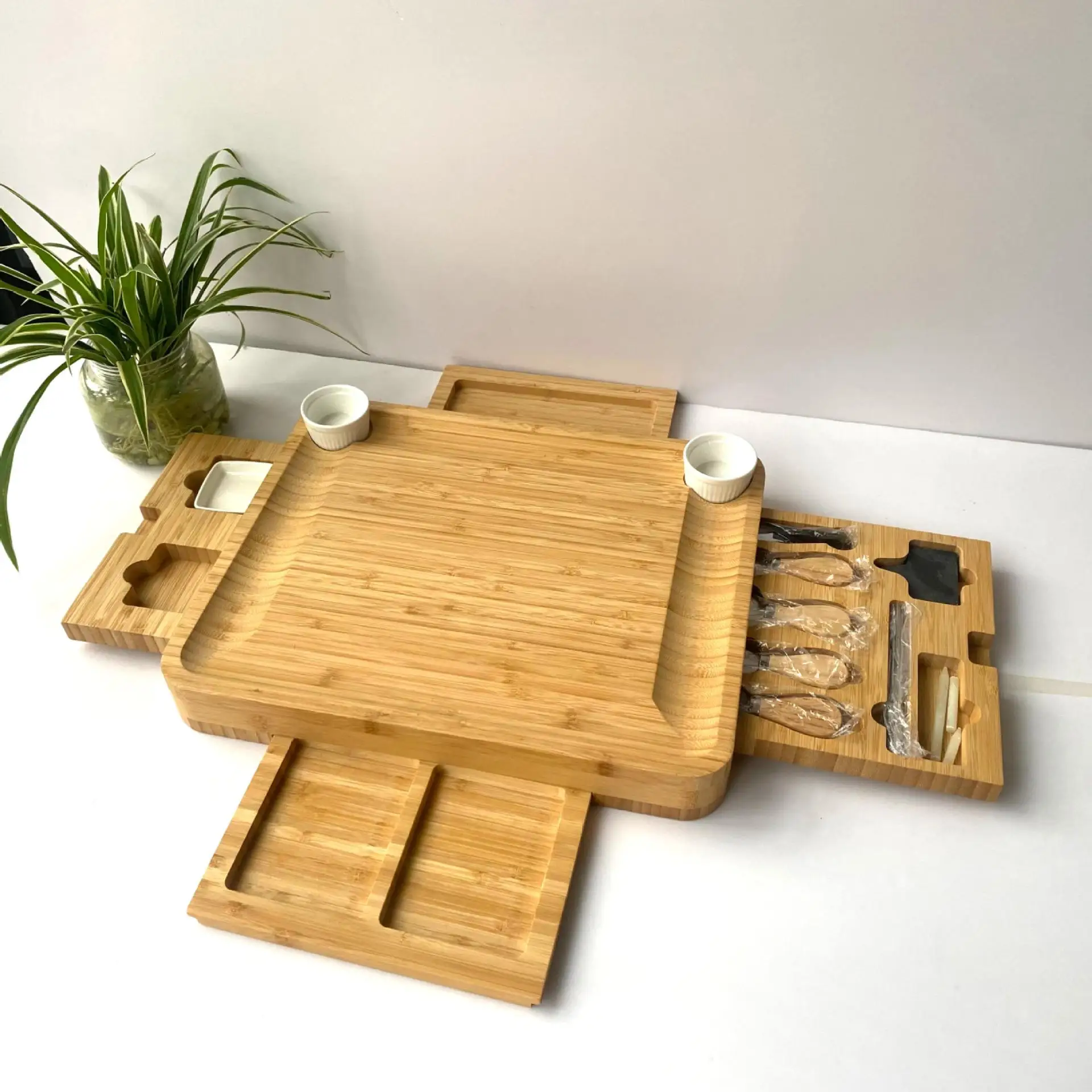 Large Bamboo Cheese Cutting Board Set with Hidden Slide Drawers Square Wood Charcuterie Platter Disposable Features Knife Set