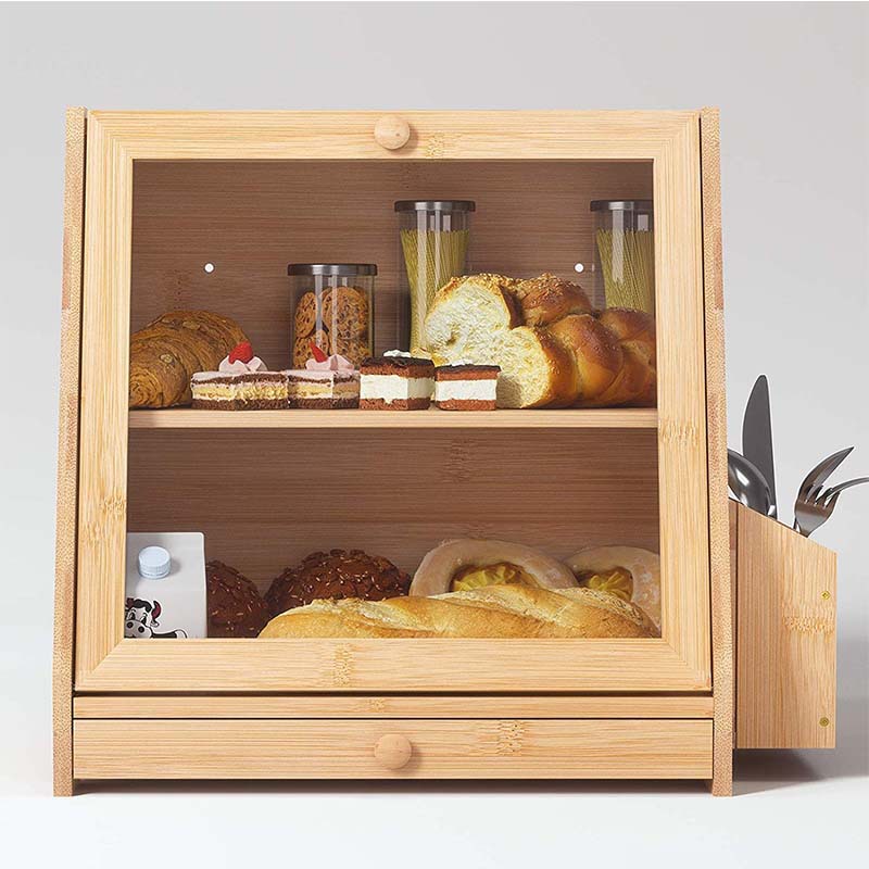 Low MOQ Bamboo Wooden Bread Box Large Bread Container Double Layer Bread Storage with Clear Windows