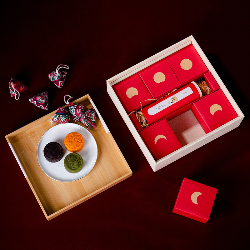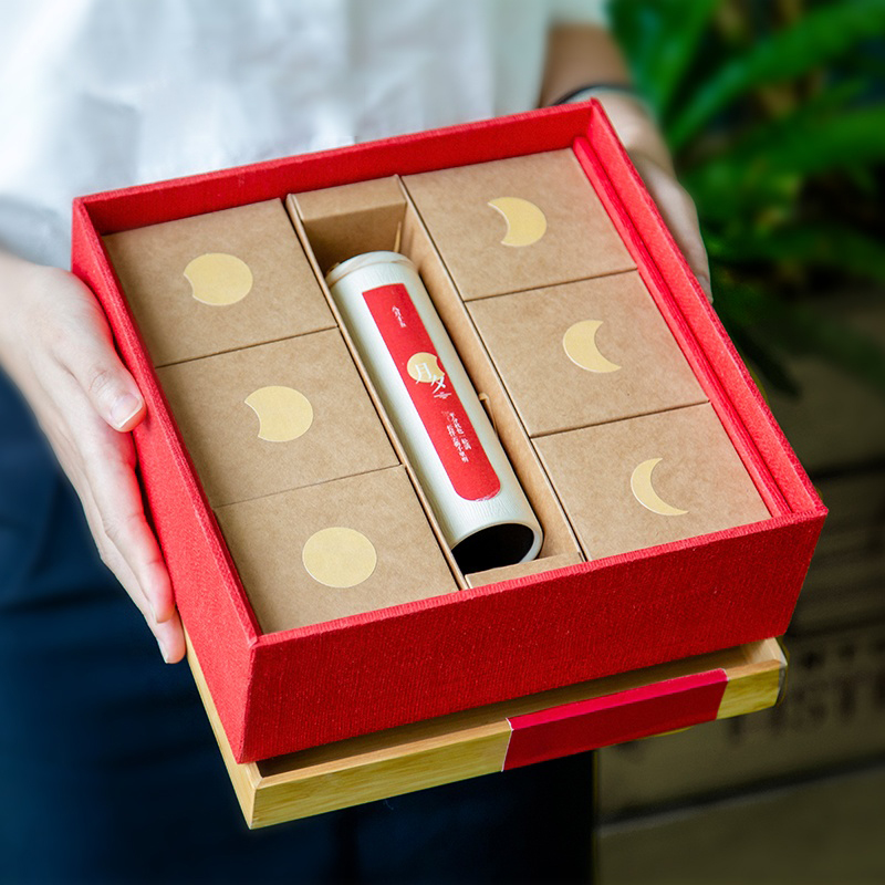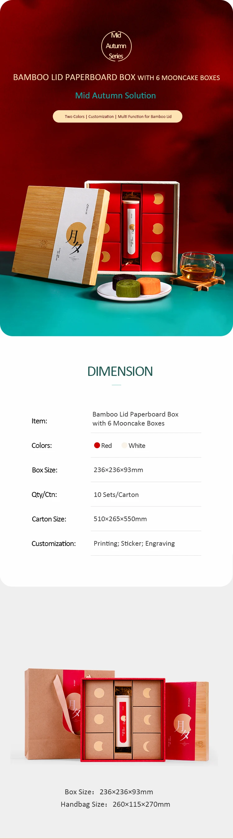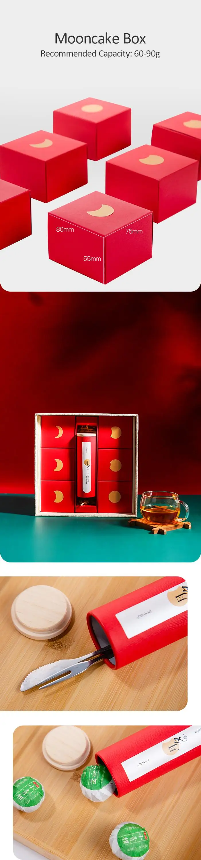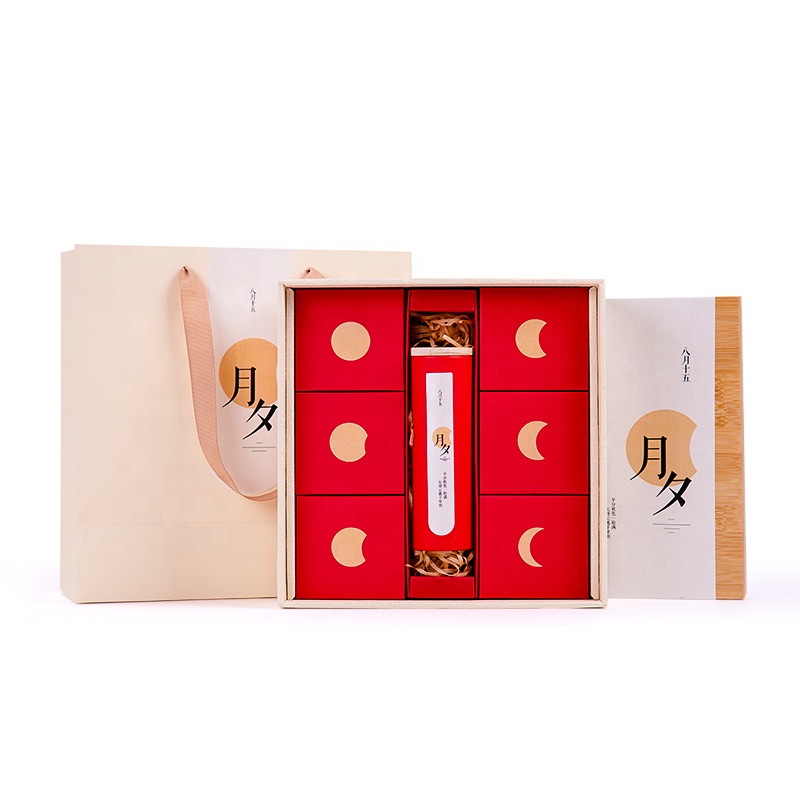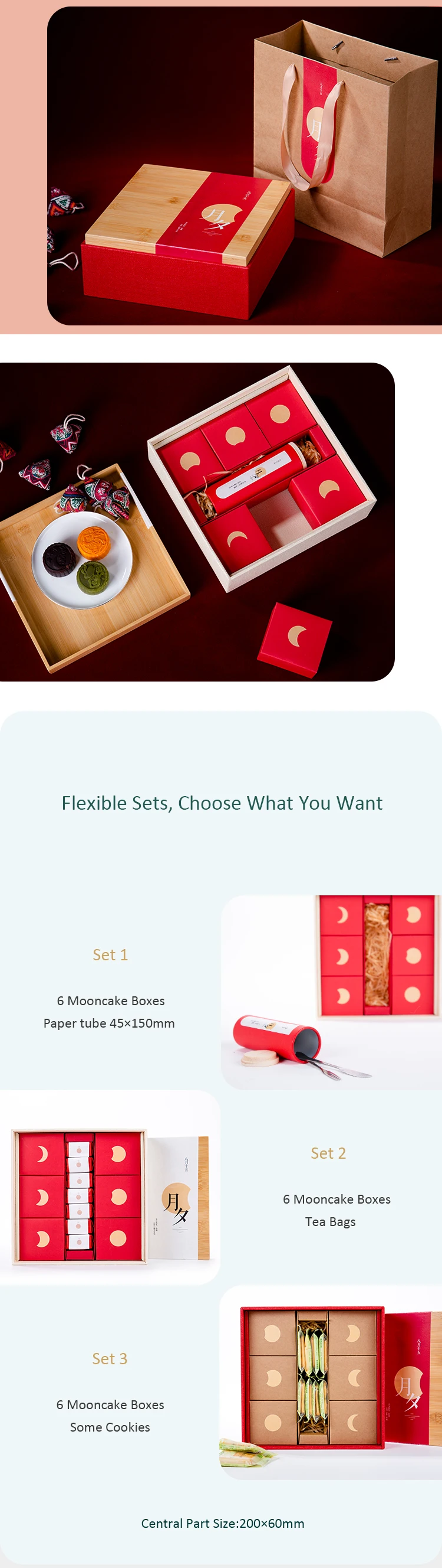 One set includes  6 mooncake boxes.a paper cansiter in 45x150mm size.  a paper bag.