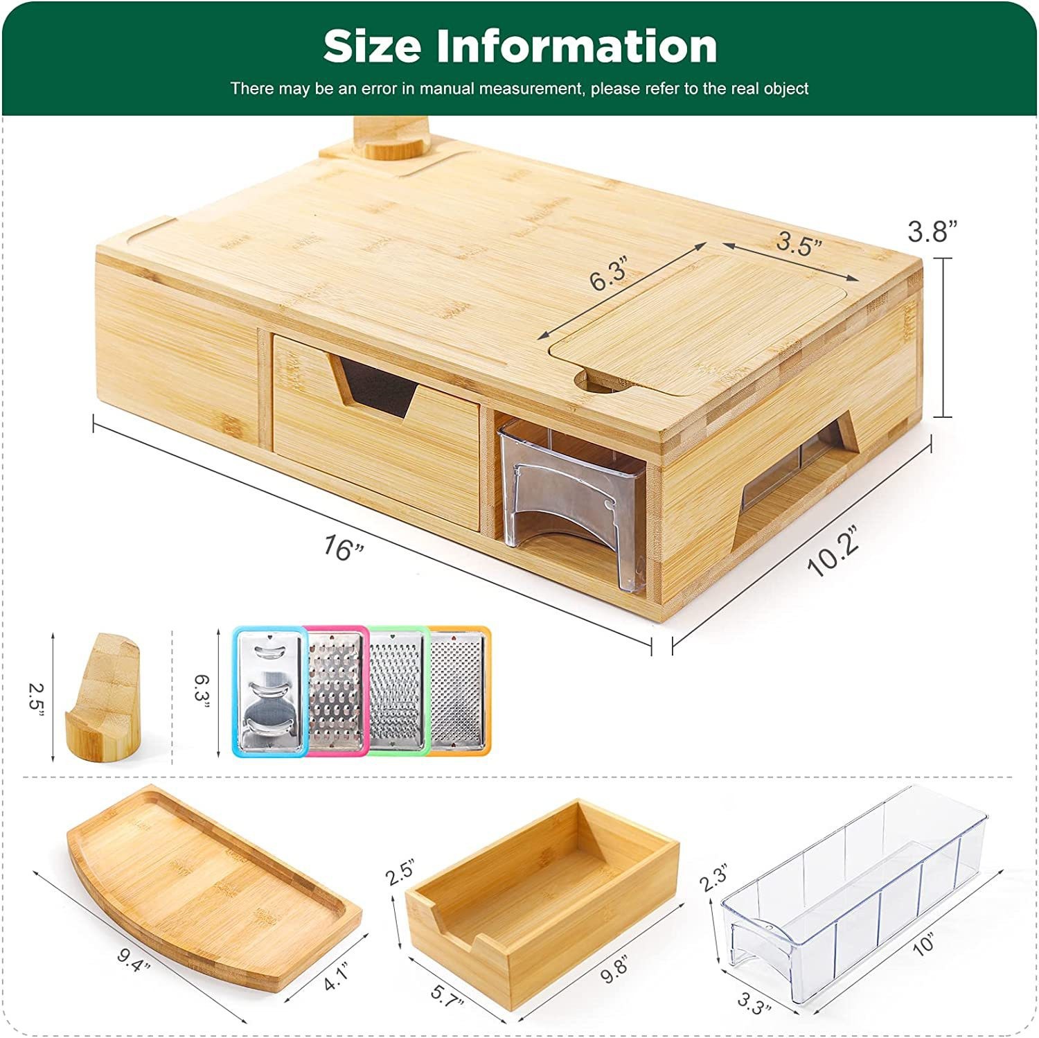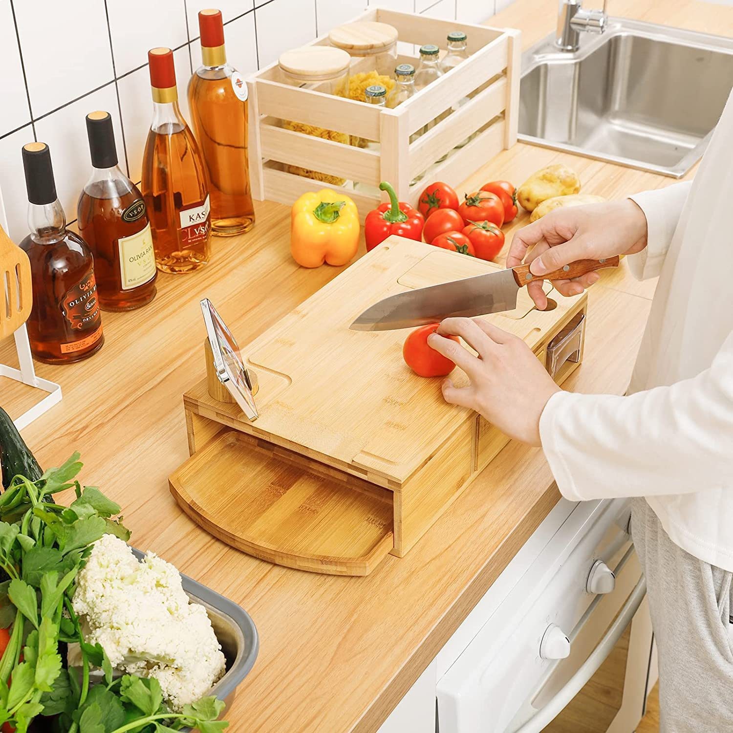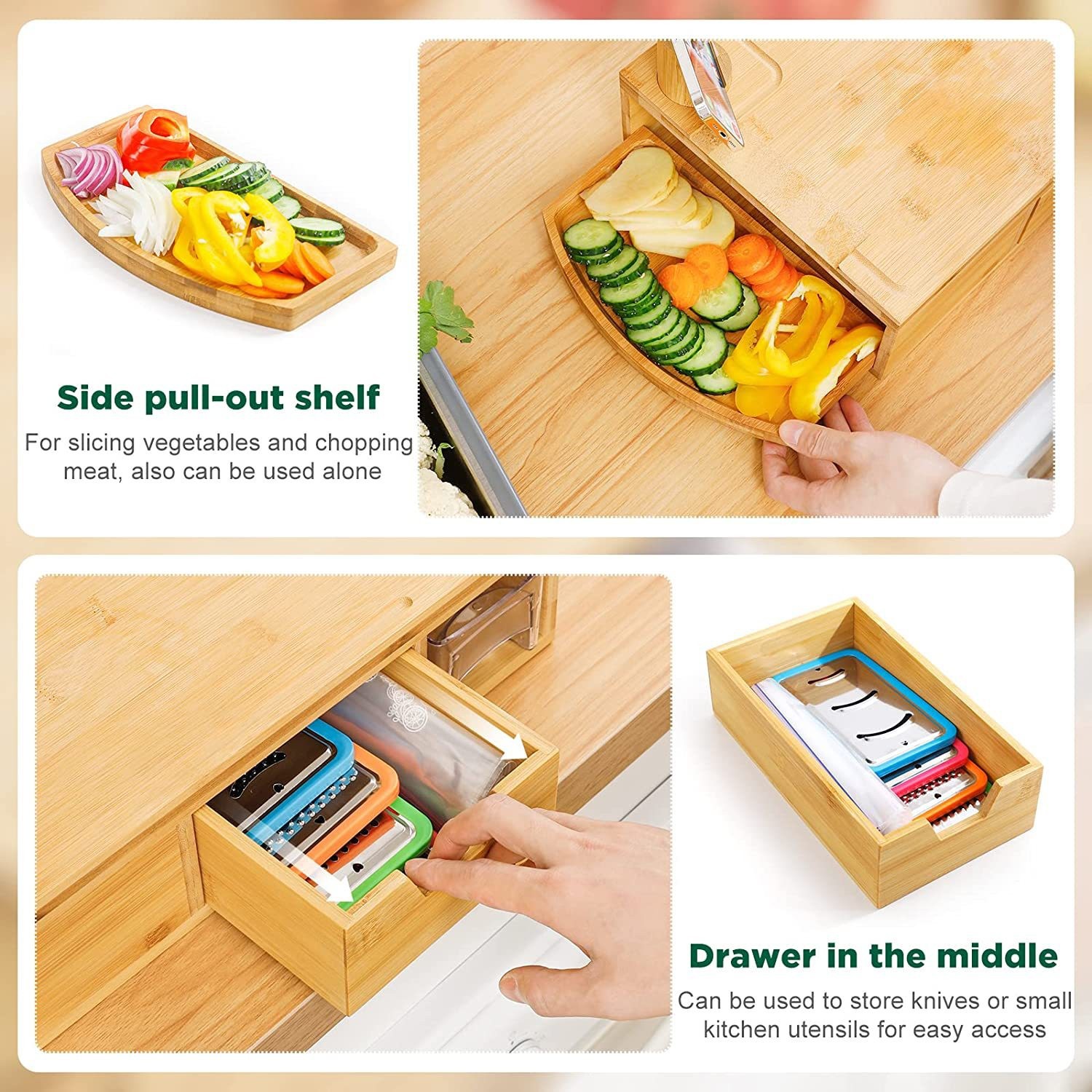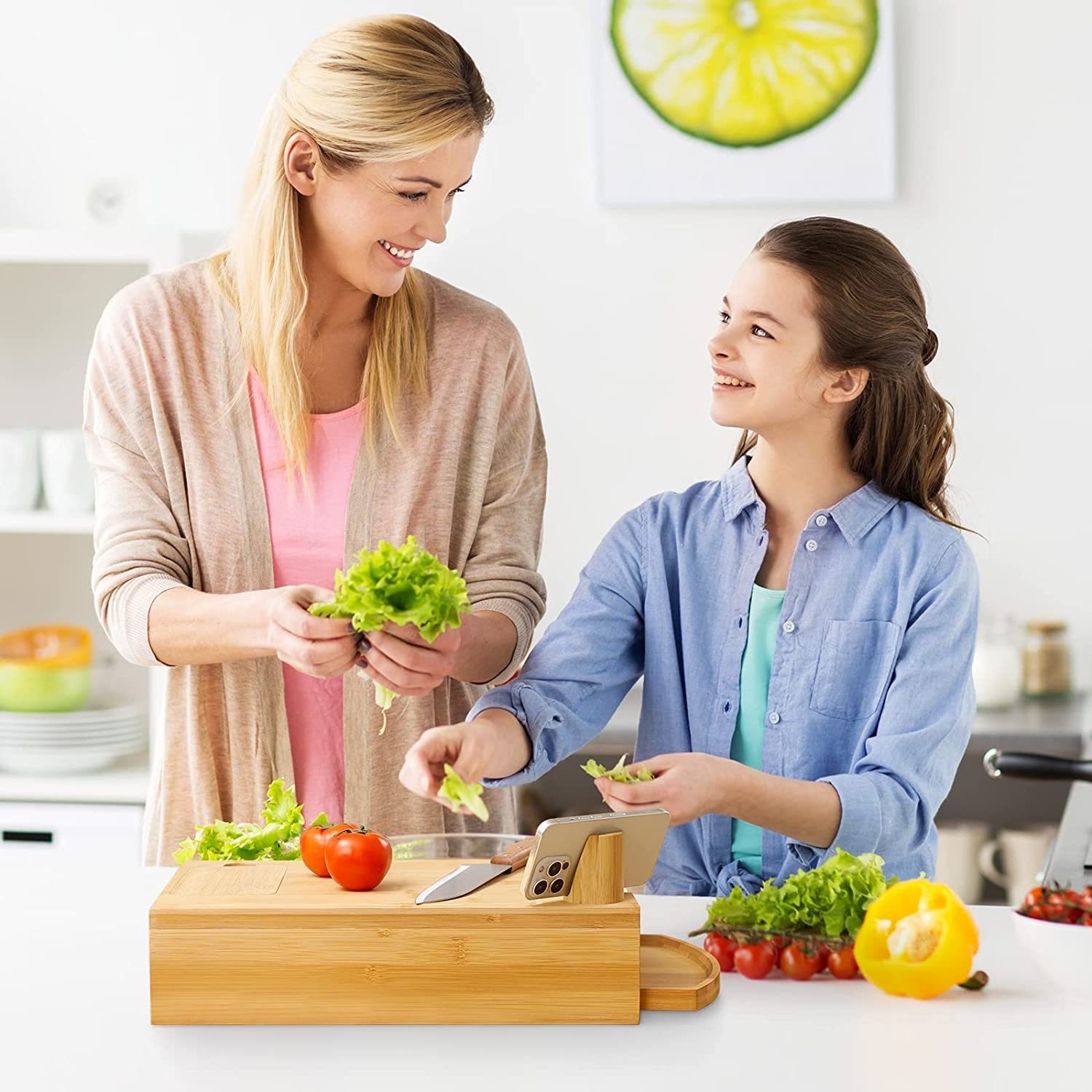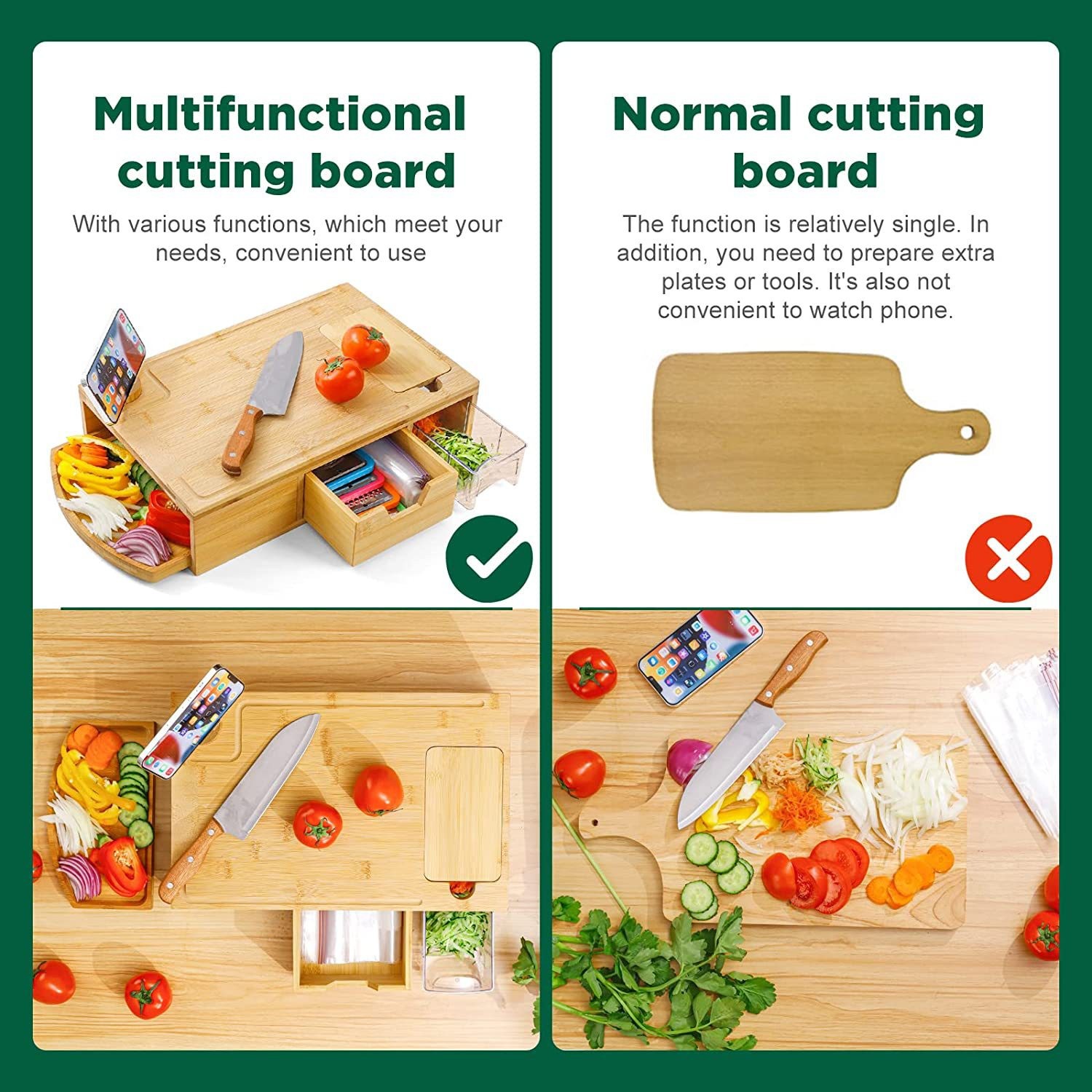 Multifunction Bamboo Wooden Cutting Board with Container Drawer & Phone Holder Chopping Board for Kitchen