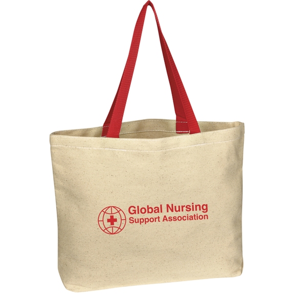 Put a unique twist on a classic with the Natural Cotton Canvas Custom Tote Bag . This is the ideal way to bring essentials to work, school, and anywhere else your day takes you. It’s made of durable cotton canvas and has sturdy 20-inch handles designed for ultimate comfort. Choose from five striking handle colors that will perfectly complement your custom imprint!