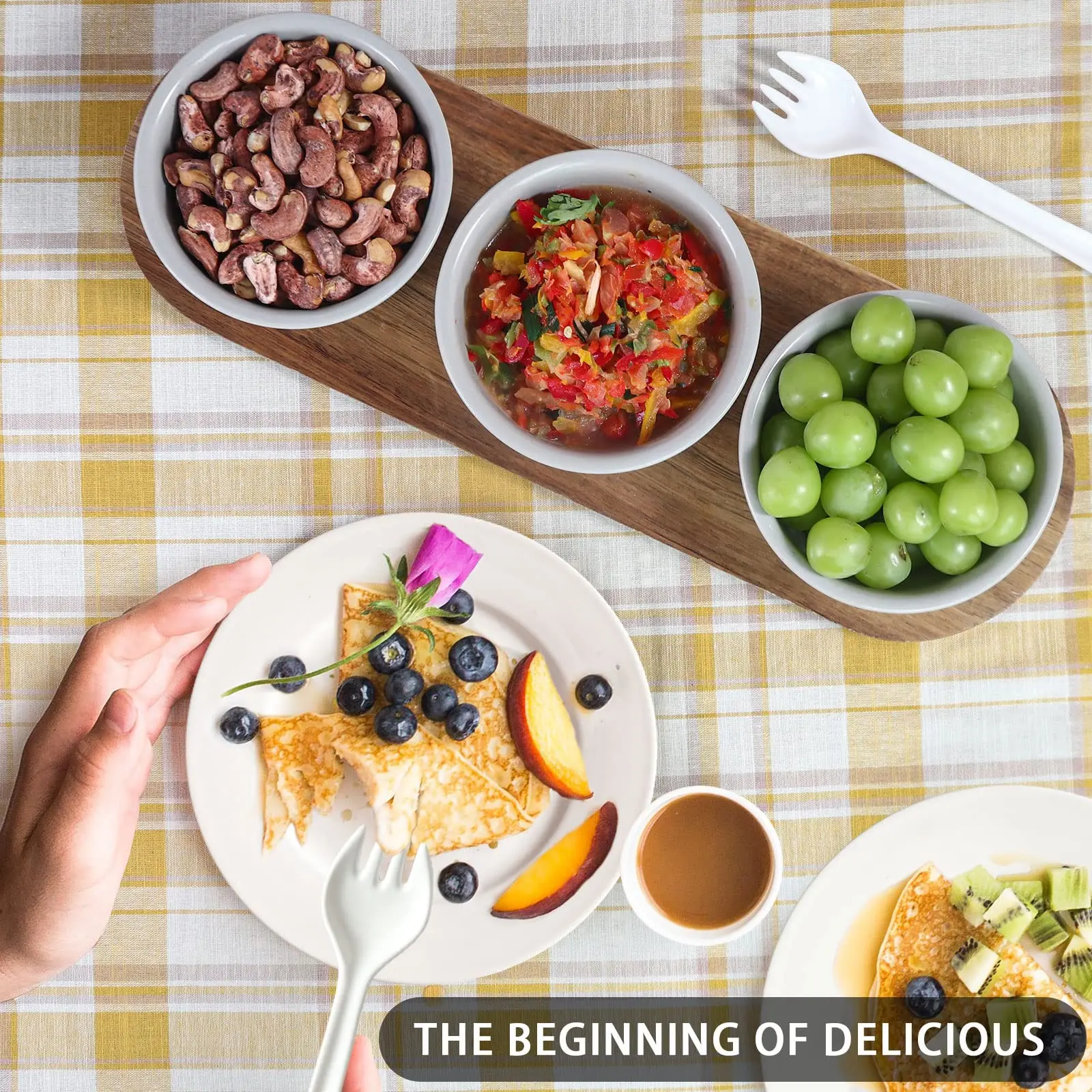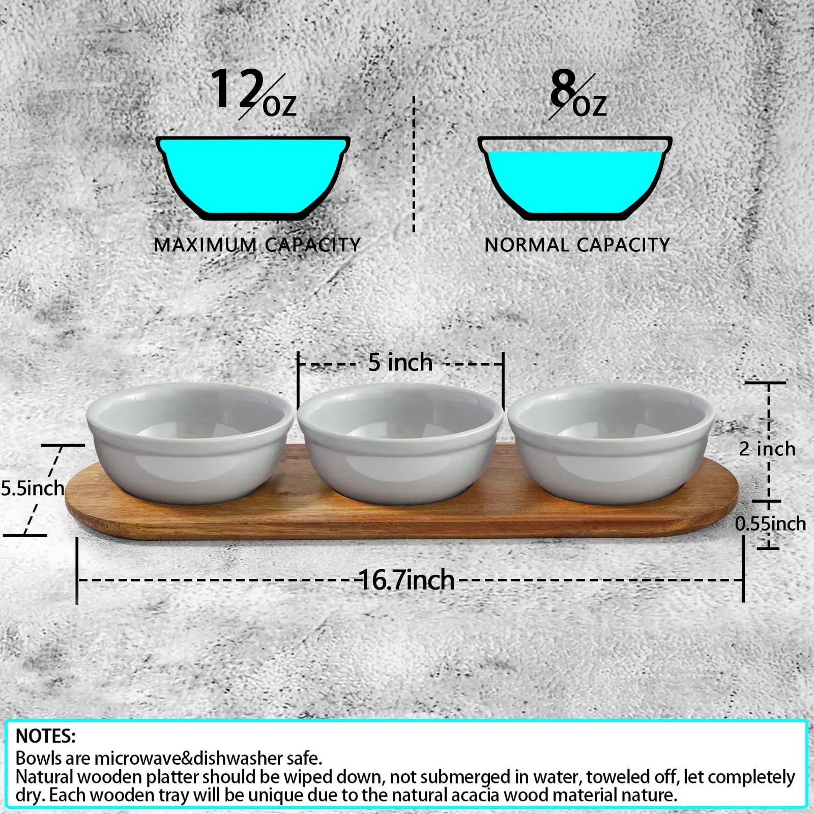 * The bowls are just the right size for treats. nuts. queso. guacamole. salsa etc. The wood board is beautiful and fits the bowls perfectly.