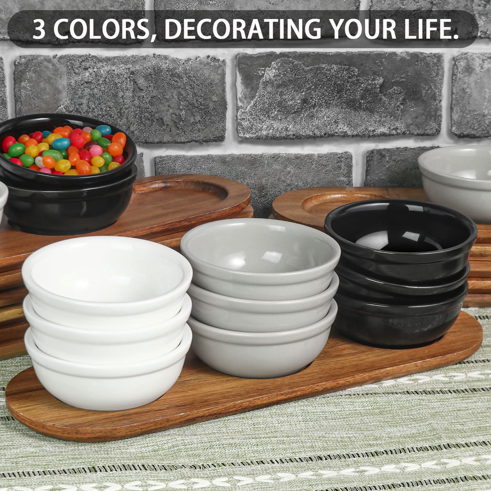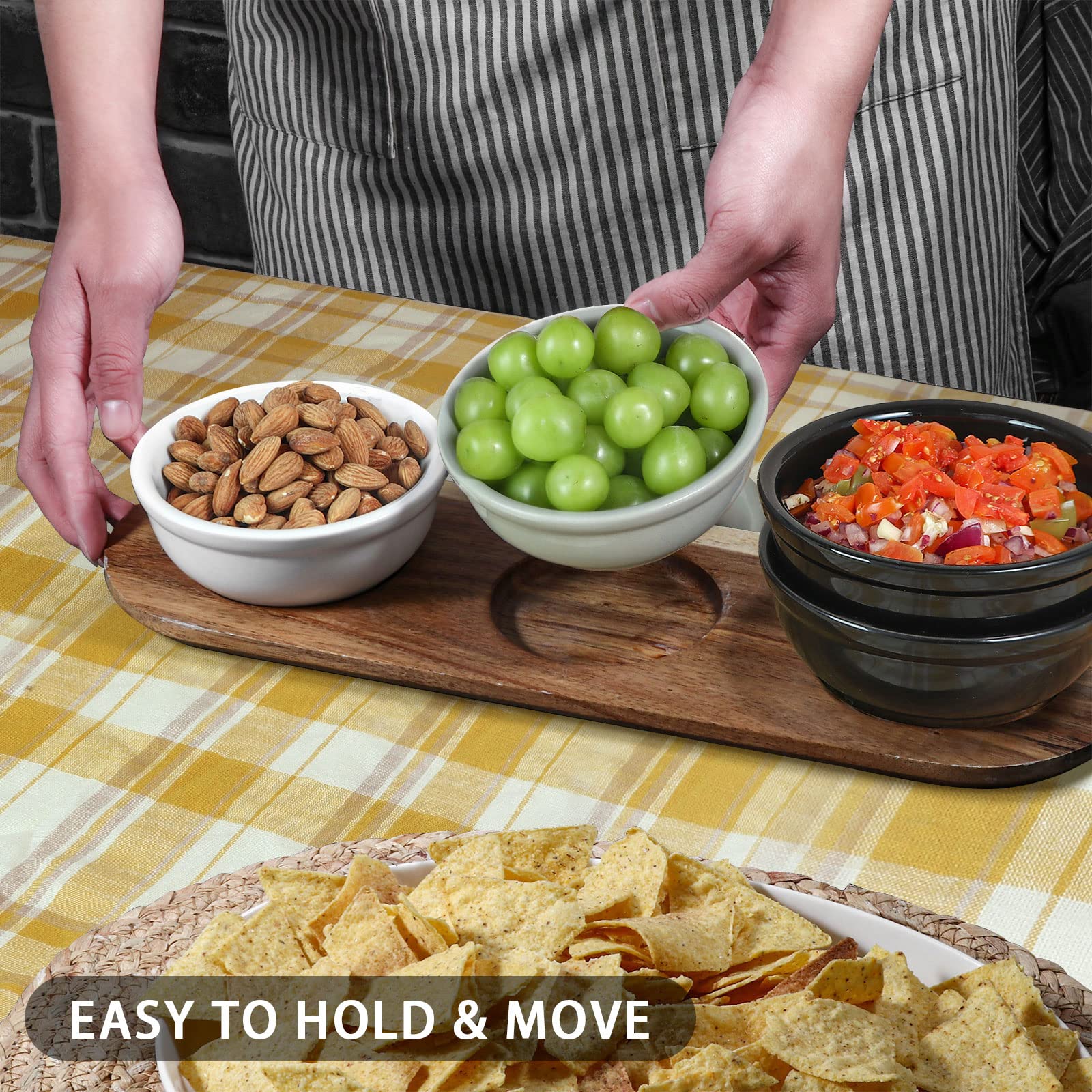* The bowls are just the right size for treats. nuts. queso. guacamole. salsa etc. The wood board is beautiful and fits the bowls perfectly.