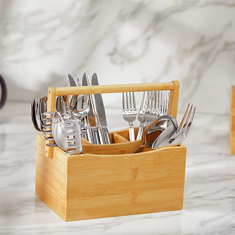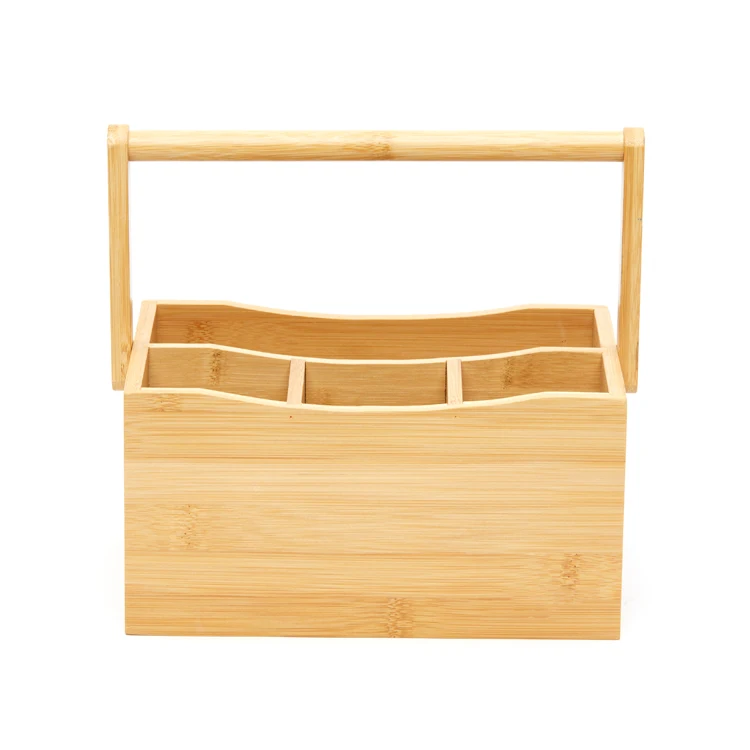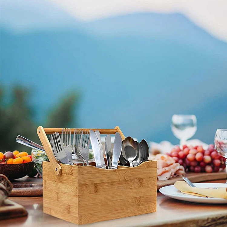 New Arrival Kitchen Countertop Bamboo Picnic Basket Utensil Holder Organizer With Folding Handle