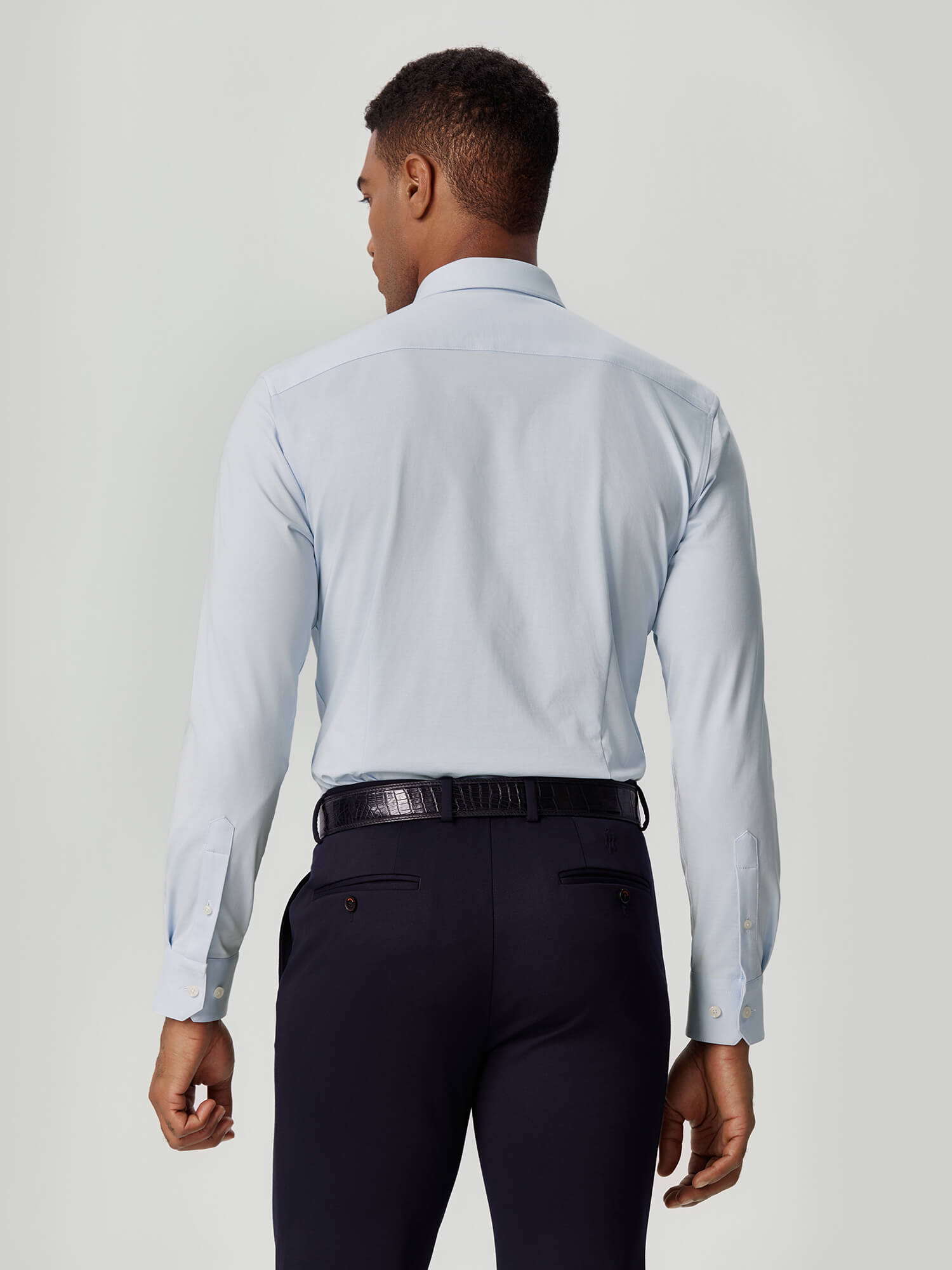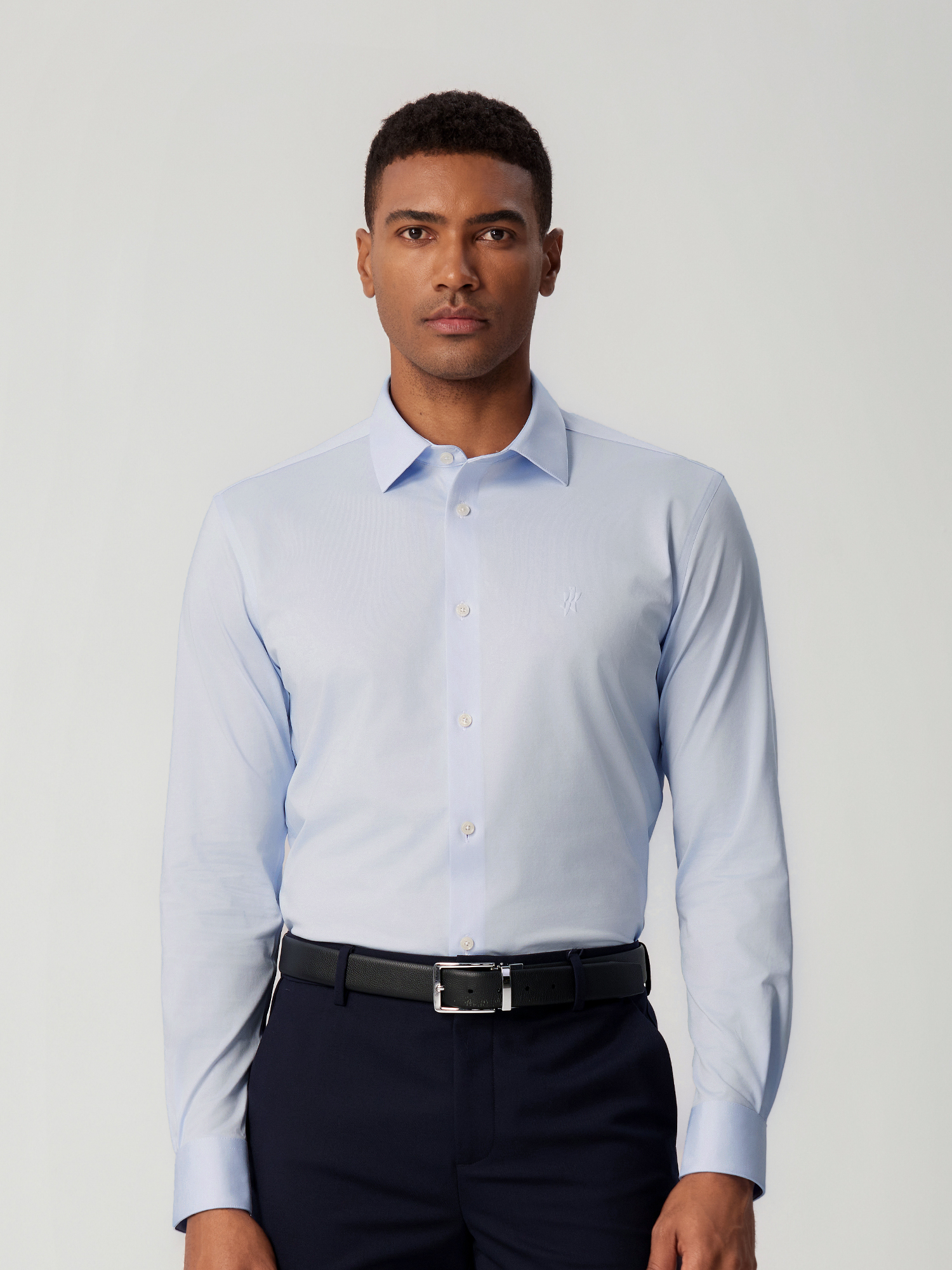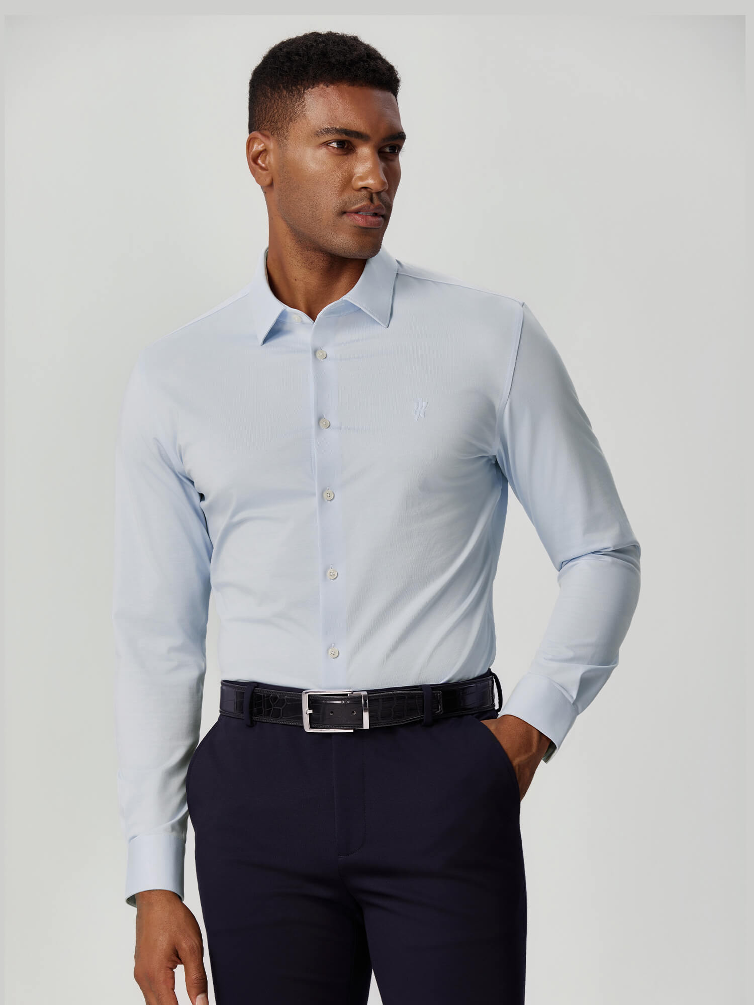 All of our non-iron cotton spandex fabrics are treated with an innovative technology that allows them to stay wrinkle-free all day long while still fitting comfortably against your skin. This classic light blue shirt is a closet essential – perfect for everything from job interviews to weddings.