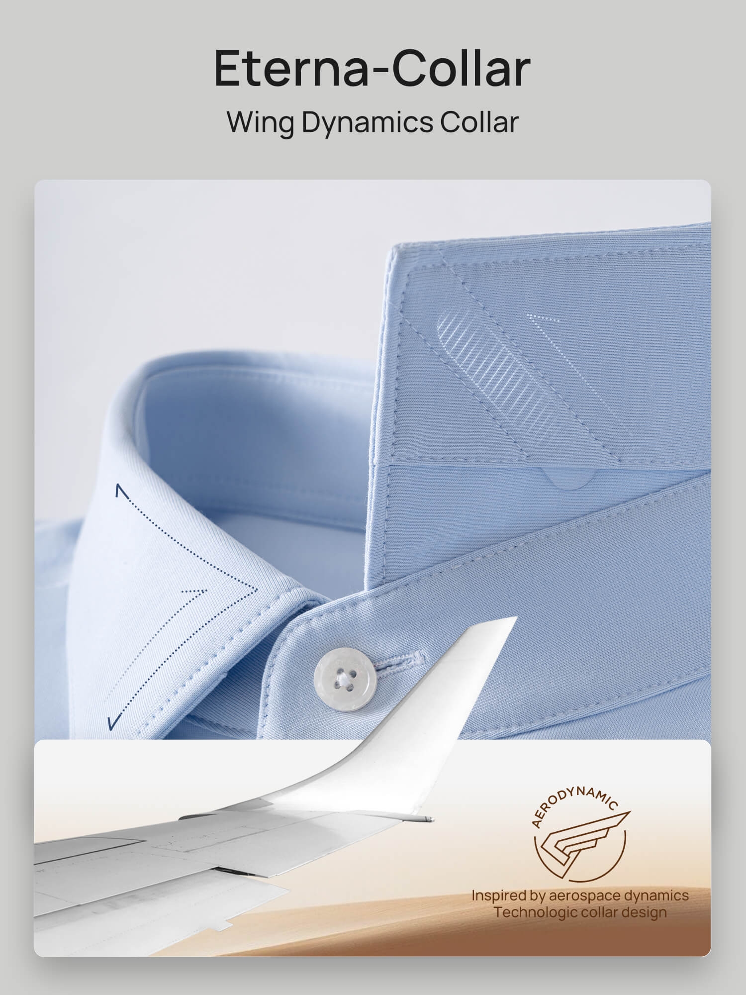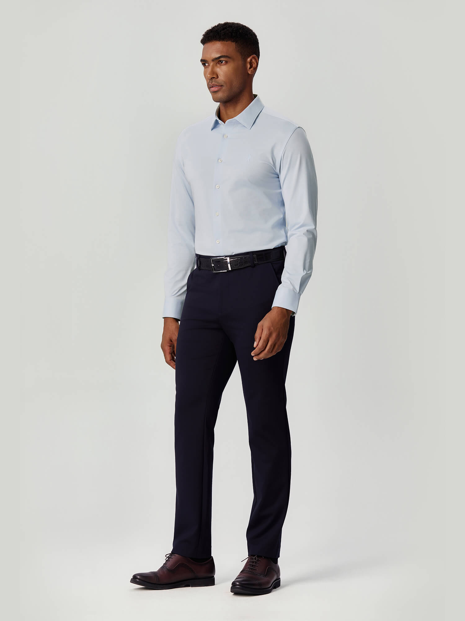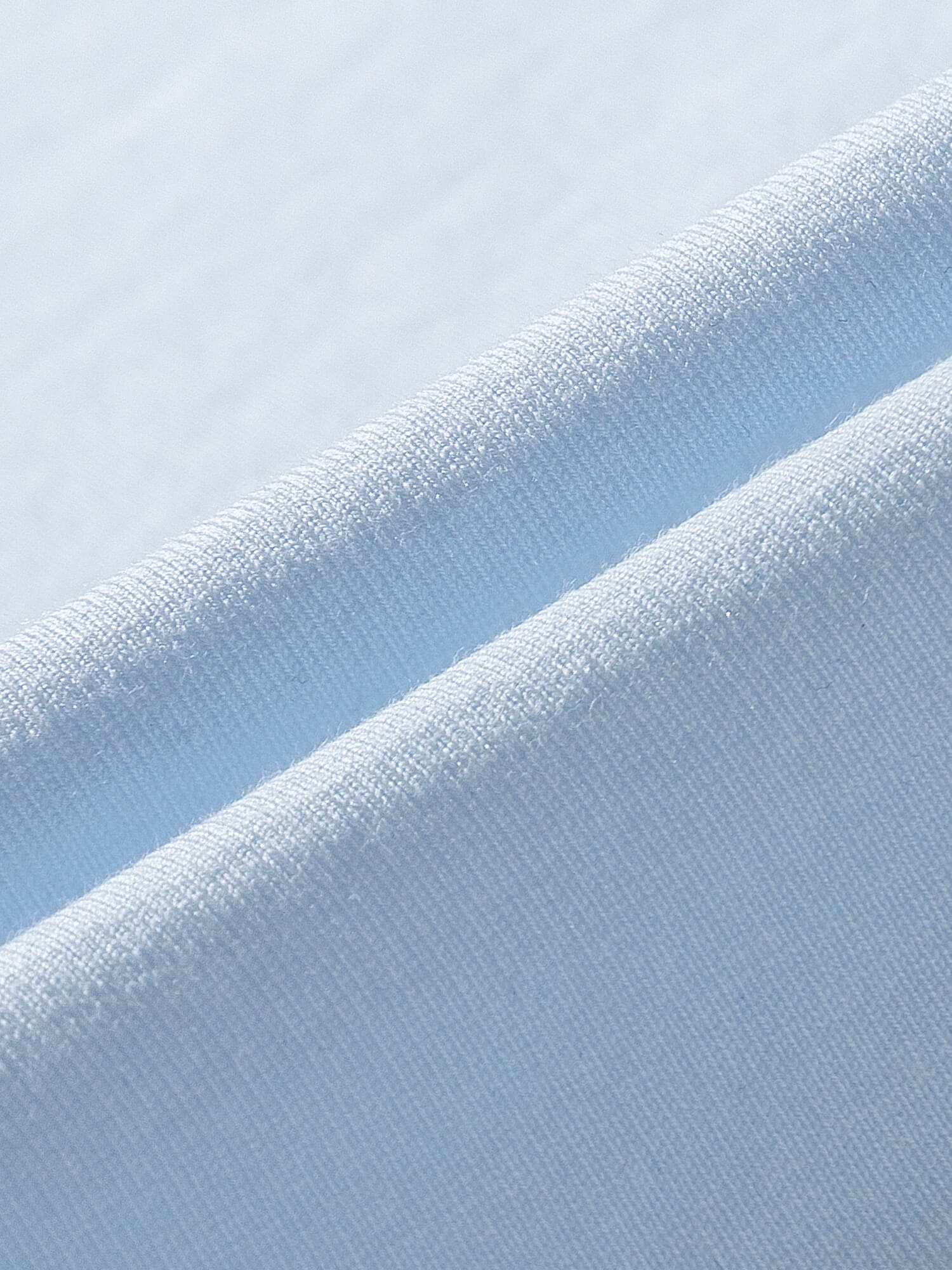 All of our non-iron cotton spandex fabrics are treated with an innovative technology that allows them to stay wrinkle-free all day long while still fitting comfortably against your skin. This classic light blue shirt is a closet essential – perfect for everything from job interviews to weddings.
