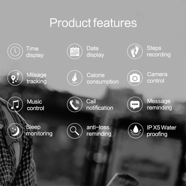 Function: 1) Date/time display, 2) Calorie consumption display, 3) Incoming calls, 4) SMS notification, 5) Control camera, 6) Control music, 7) Sleep quality test, 8) Wireless Bluetooth connection 9) Battery charging protection, 10) Anti-lost mobile phone, 11 ) Turn your wrist and touch the screen, 12) Firmware upgrade 13) Alarm clock 14) QQ micro reminder 15) Answer and hang up the call