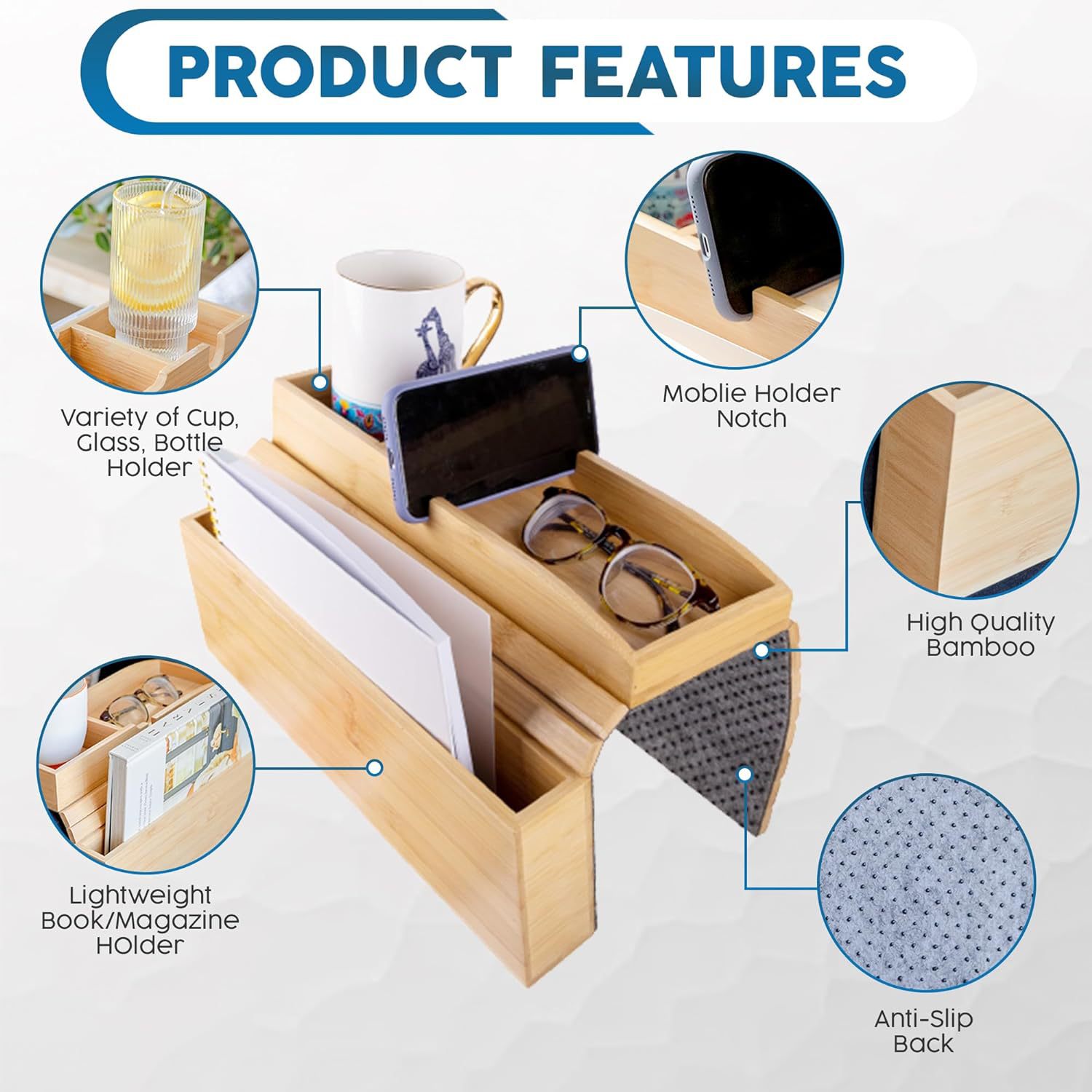 Premium Bamboo Couch Cup Holder Armrest Tray Side Storage Pocket for Snacks Drinks Remote Control & Magazines-for Living Room