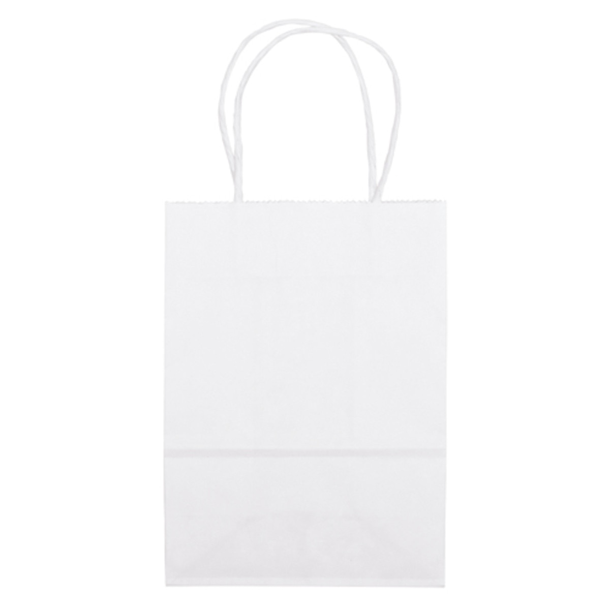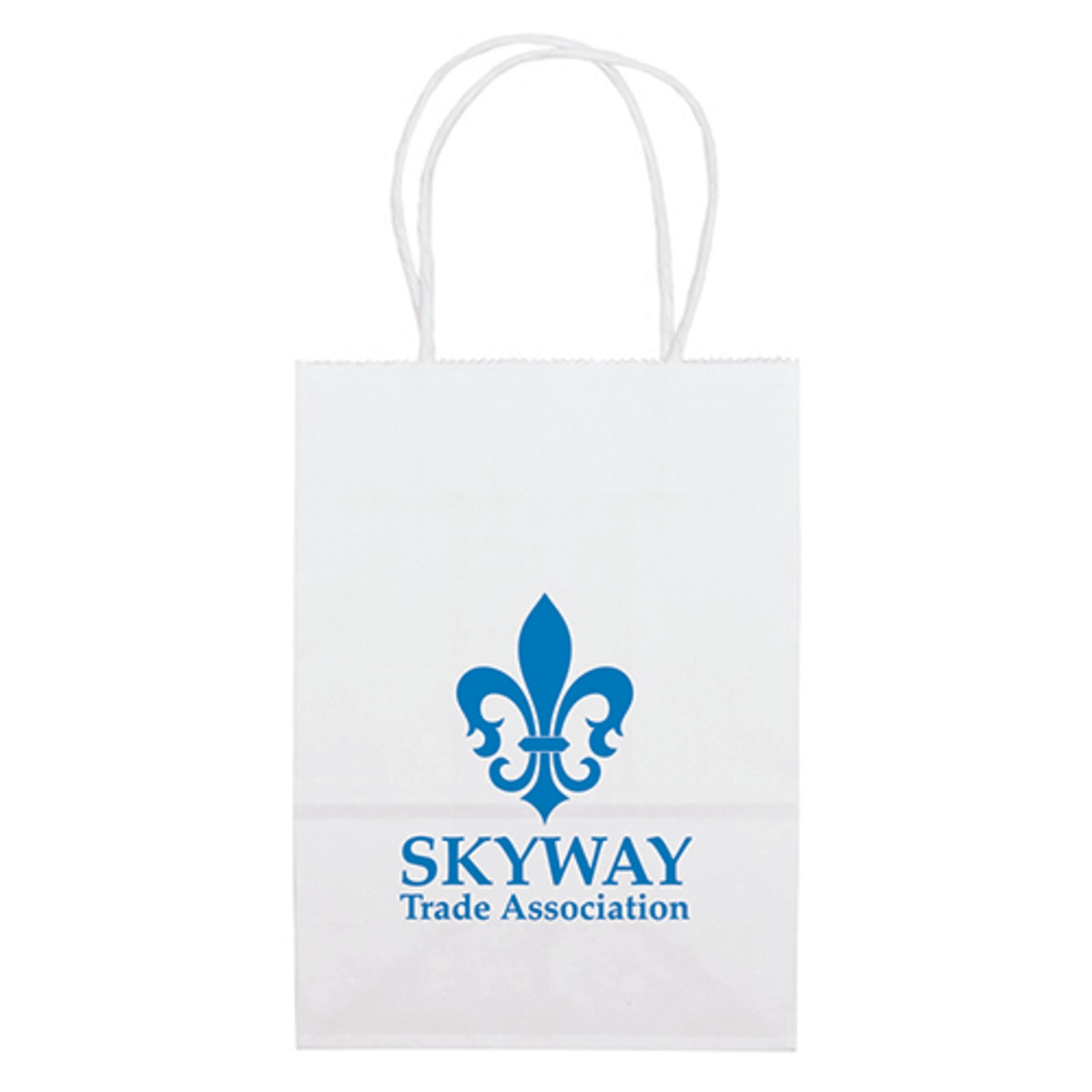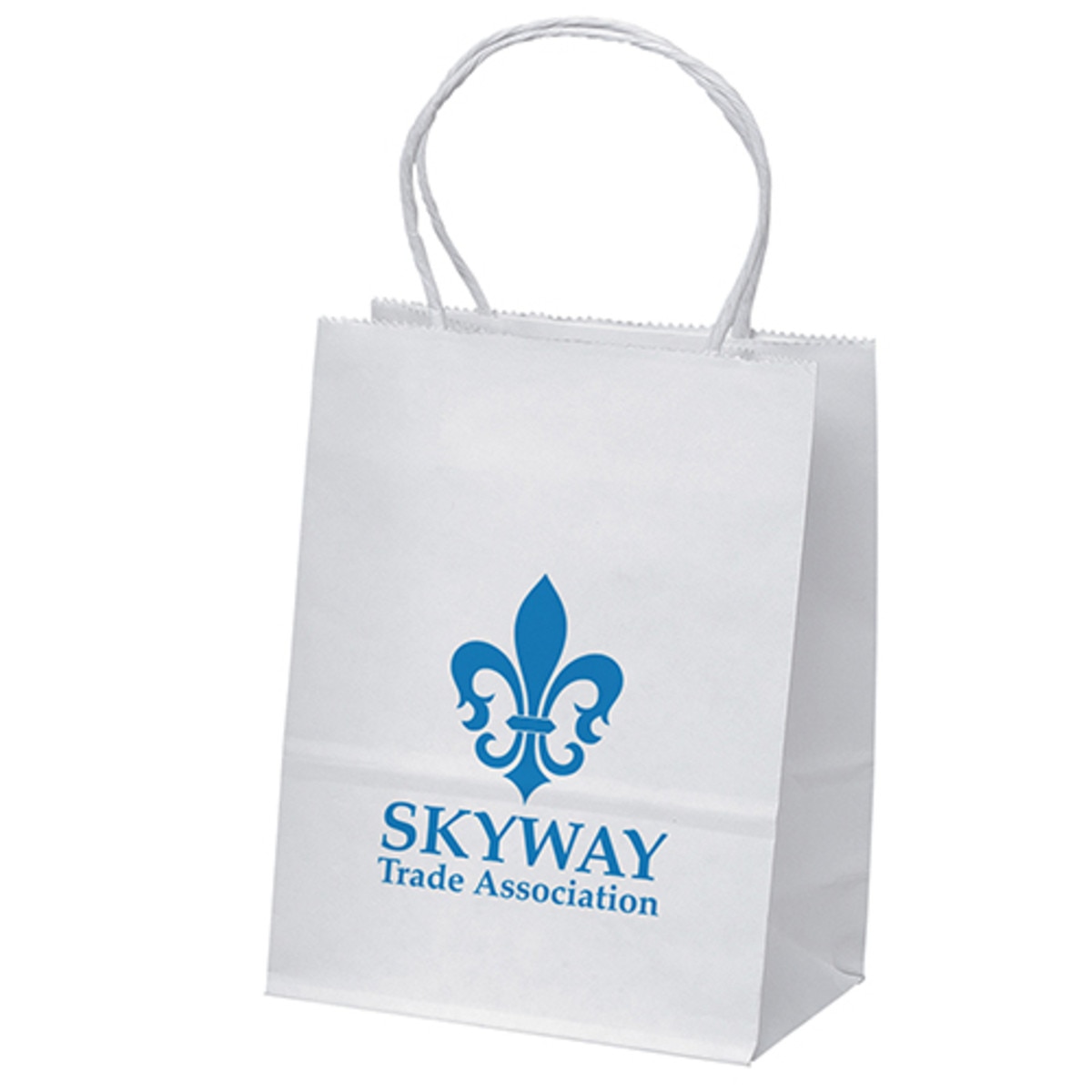 White kraft paper shopper with matching twisted paper handles and serrated cut top.