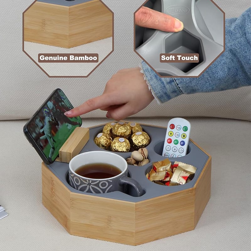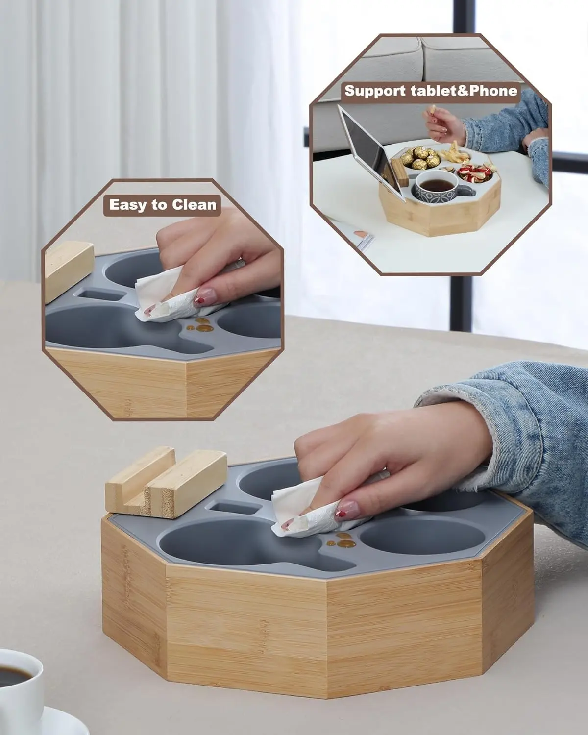 Silicone Bamboo Sofa Couch Cup Holder Tray with Remote Storage Organizer Rotatable Phone Holder for Living Room Snacks Drinks