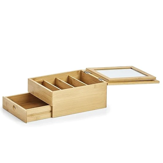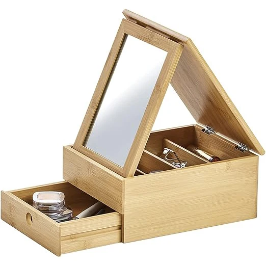 Simple Bamboo Makeup Box Jewelry Box Organizer Makeup Organizer With Mirror and Drawer