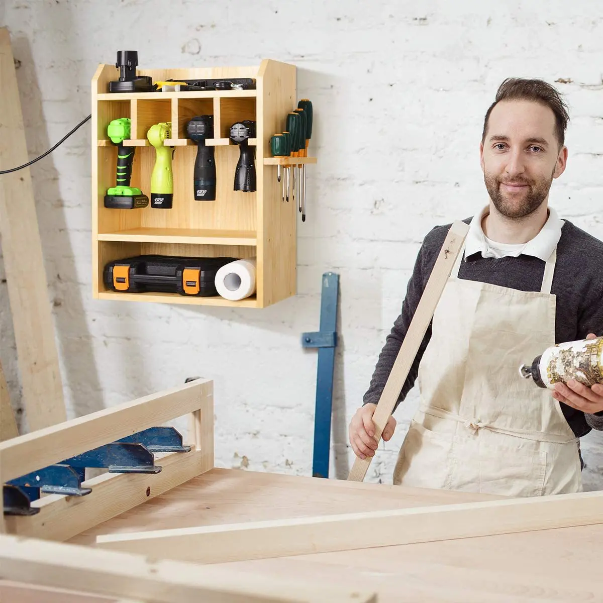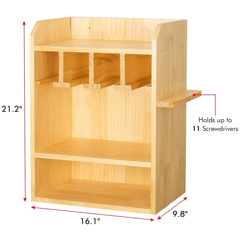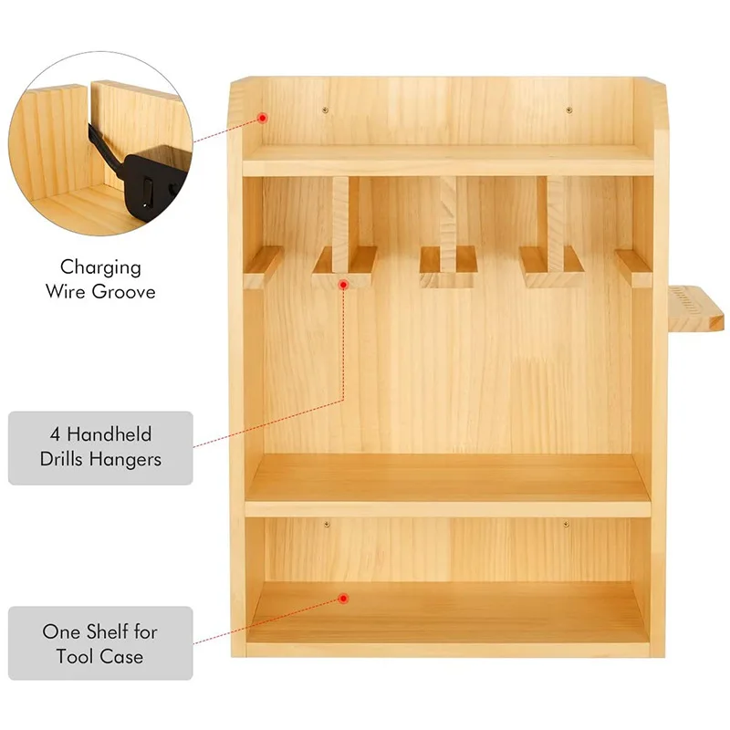 Wall-Mounted Wooden Power Tool Storage Rack Drill Charging Station Cordless Organizer Screwdriver Storage Bin for Home Workshop