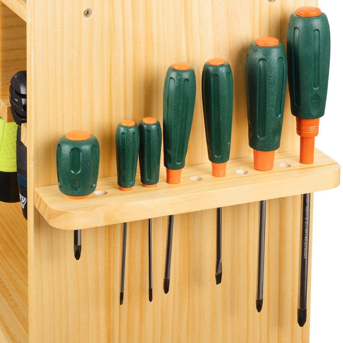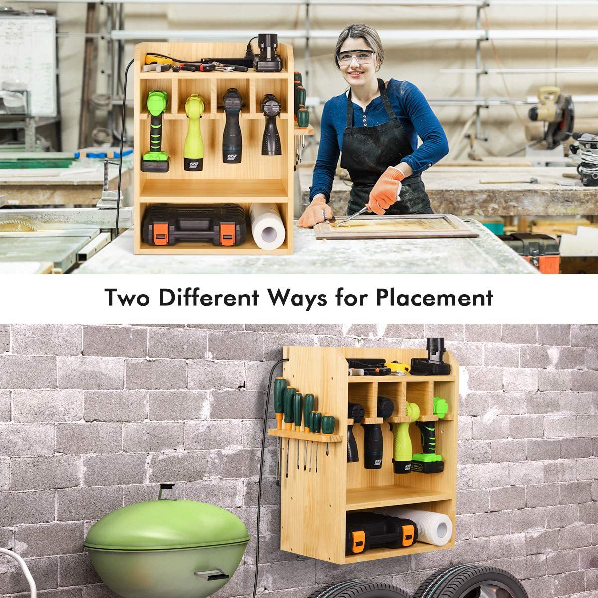 Wall-Mounted Wooden Power Tool Storage Rack Drill Charging Station Cordless Organizer Screwdriver Storage Bin for Home Workshop