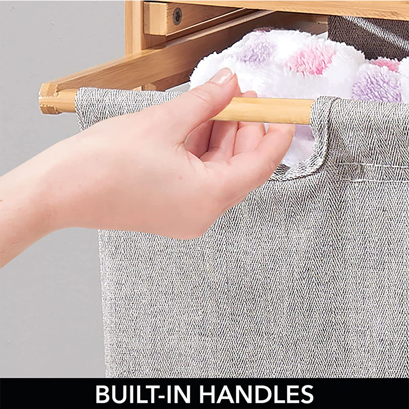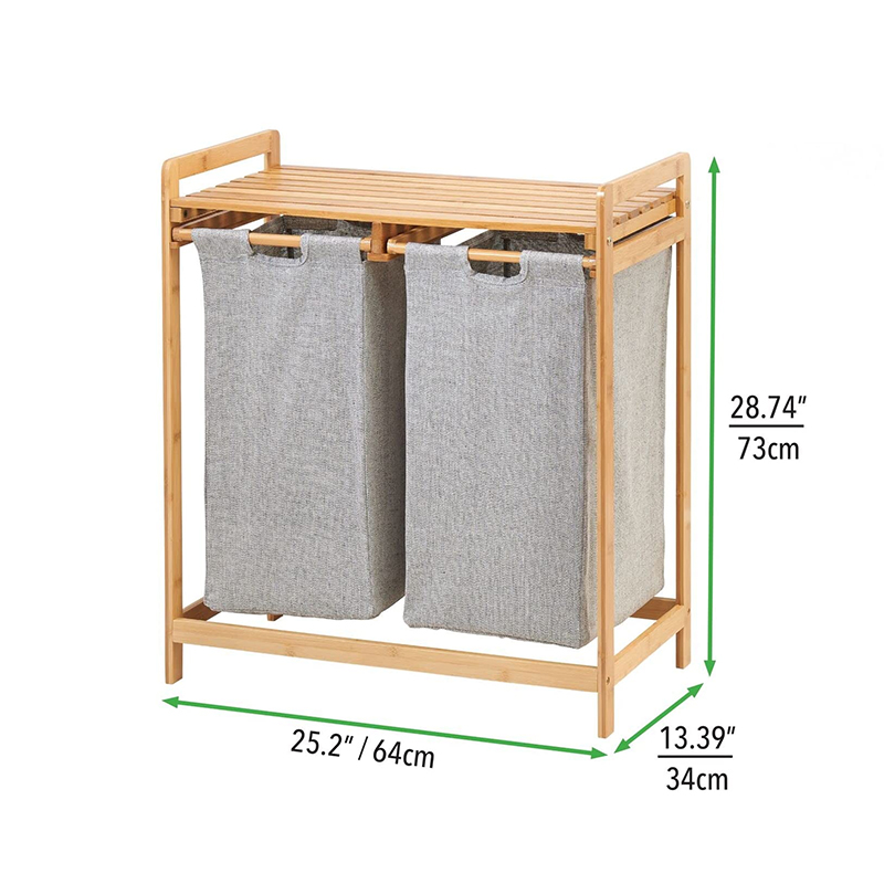Wholesale Bamboo Laundry Hamper with Dual Compartments Two Section Laundry Basket Removable Sliding Bags Shelf