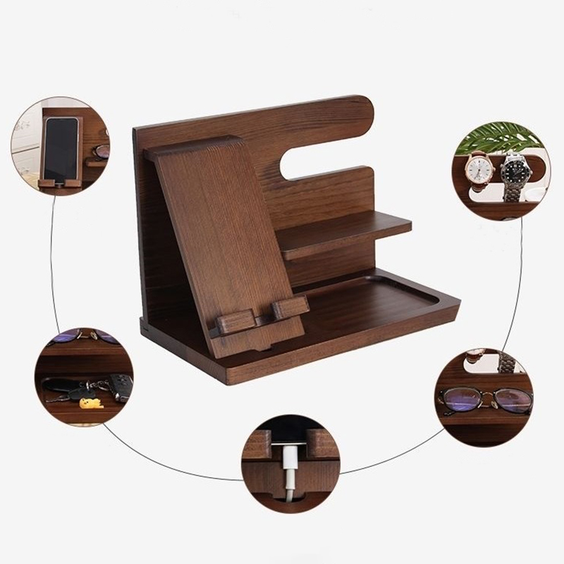 Wholesale Modern Bamboo Docking Station Universal Cell Phone Holder Stand Key Holder Watch Organizer for Home Office Tableware