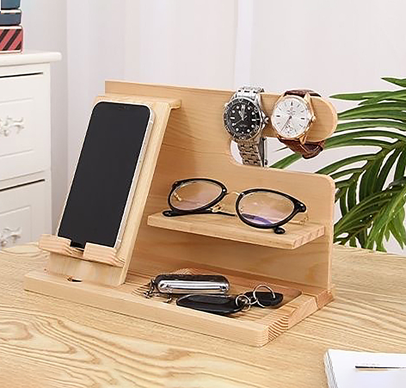 custom Wood Docking Station Tray Two Cell Phone Smartwatch Key Holder Men Charging Accessory Nightstand Father Mobile Gadget