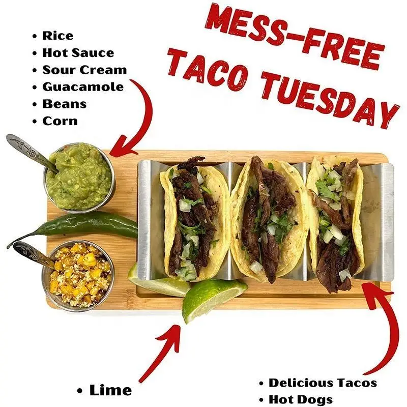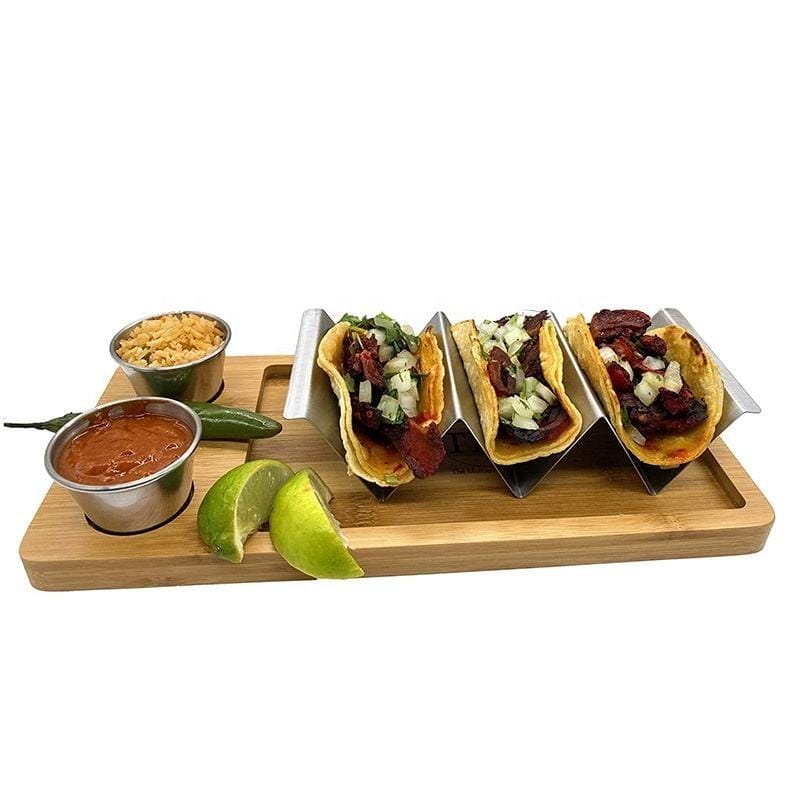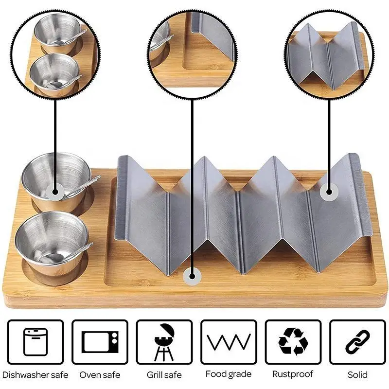 Wholesale Stainless Steel Taco Stand Holder With Bamboo Tray Set Taco Tuesday With Two Sauce Holders and Two Spoons