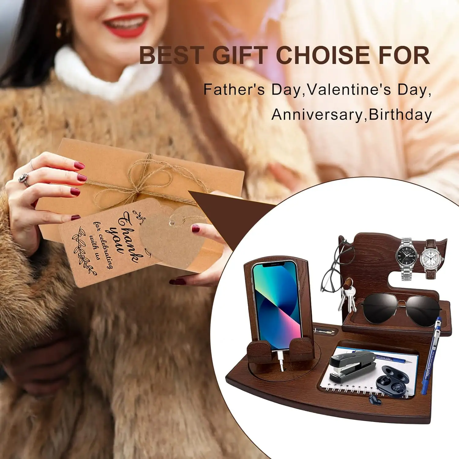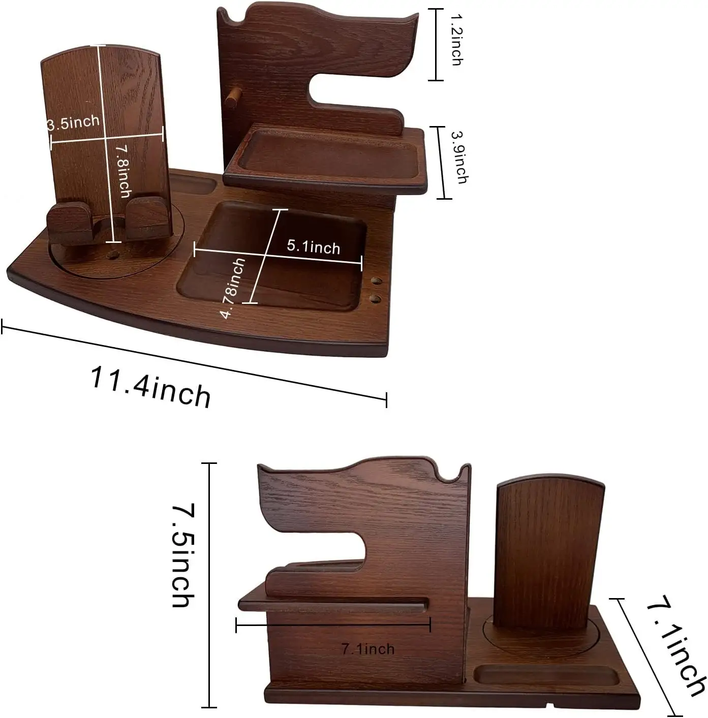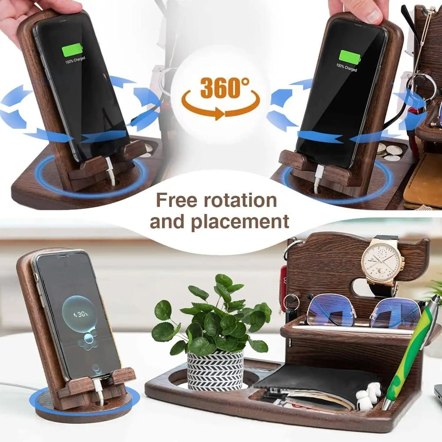Wooden Cell Phone Holder Stand Watch Organizer 360 Swivel with Charging Station Two Large Shelves Non-toxic Protective Finishing